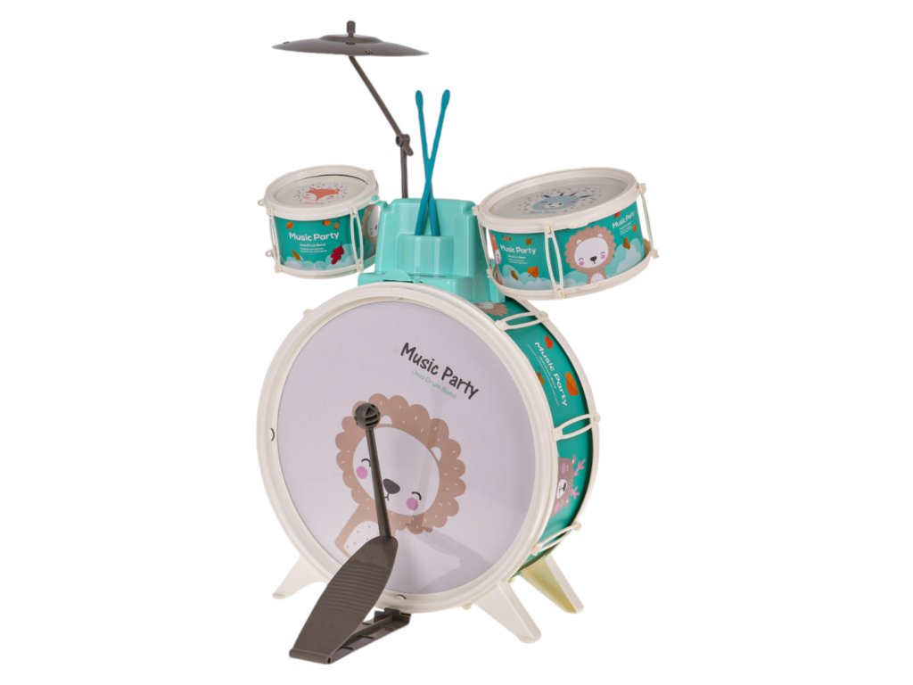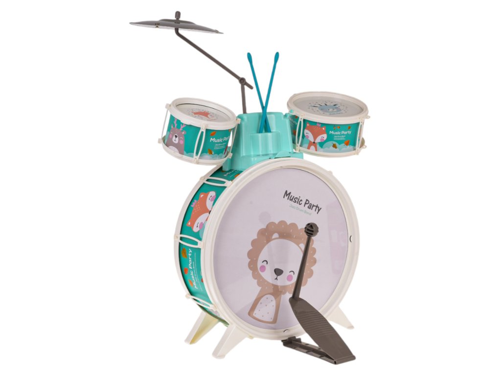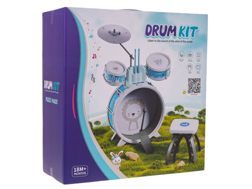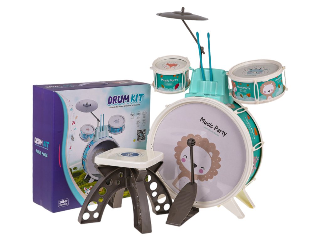 Drums for the youngest children from 18 months of age with a stool included. The toy is made of the best quality materials in vivid colors that attract the child's eye. The drums consist of 3 drums decorated with pictures of animals such as a lion, donkey or fox, a plate and sticks. We also have a comfortable stool for sitting.