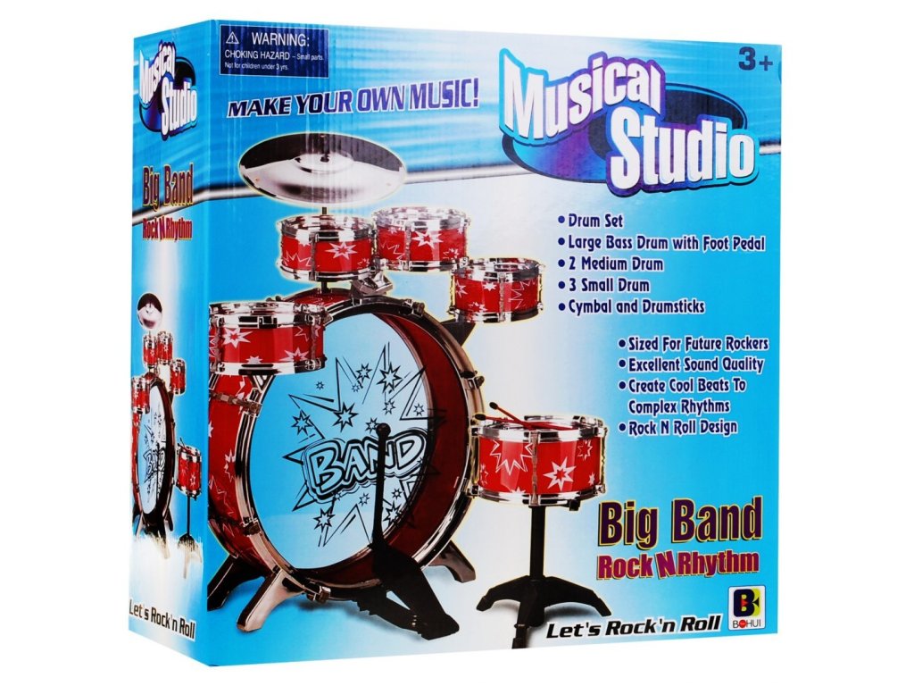 -one big drum with pedal, -one medium drum, -three small drums, -one drum medium stand, -two chopsticks, -palte, -stool. | |