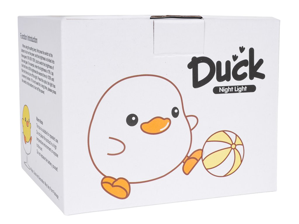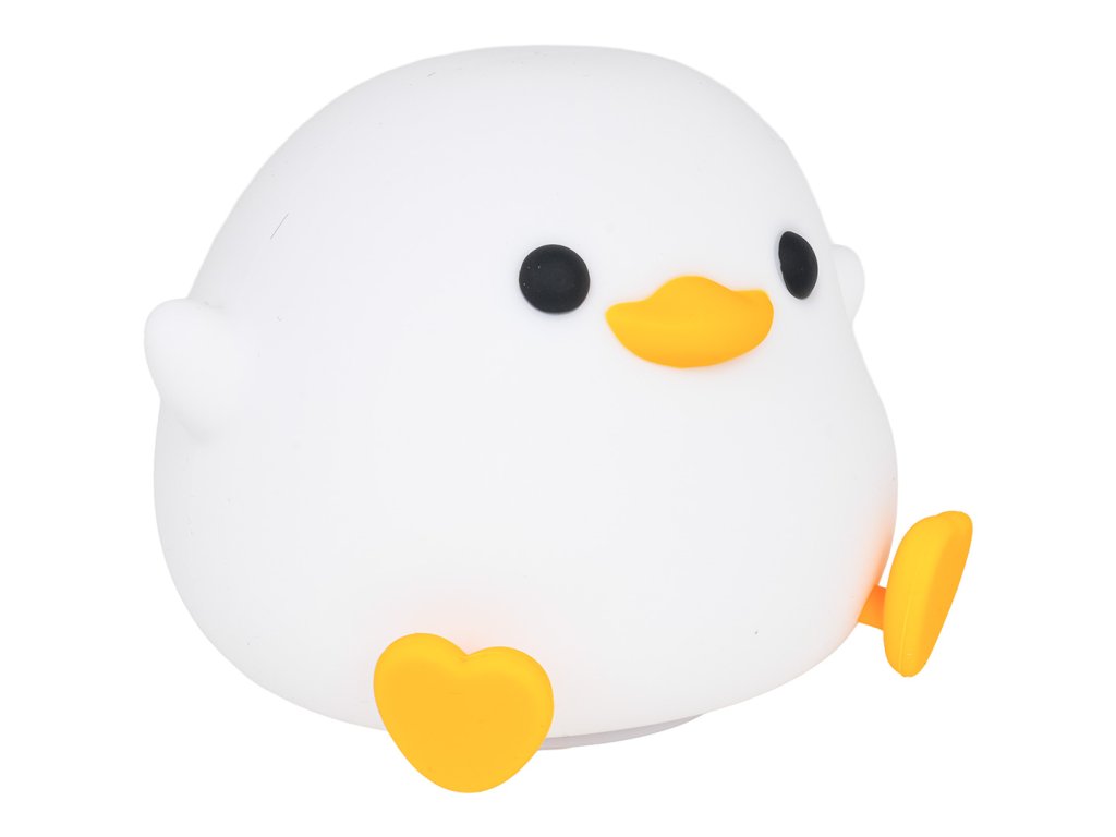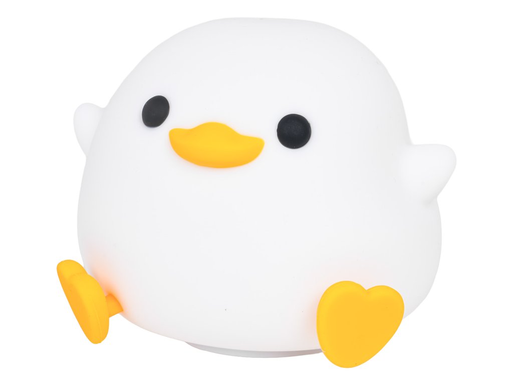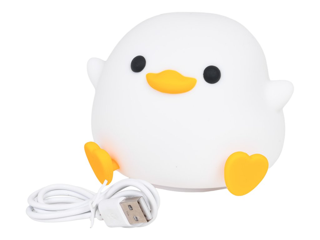 A ducky night light for children aged three and up. Made of soft, comfortable BPA-free silicone, it emits a warm, gentle light, creating a cozy and safe environment. It offers three brightness levels (10%, 50%, 100%). The lamp has a built-in 3.7V battery, charged via a USB Type-C cable. Thanks to the touch sensor, you can turn the lamp on or off and adjust the light intensity by touching it anywhere.