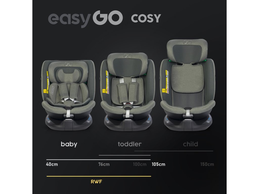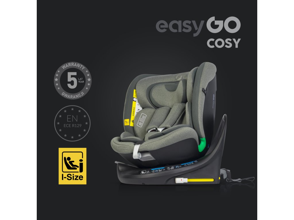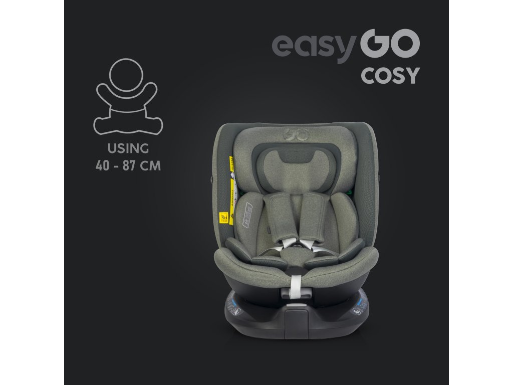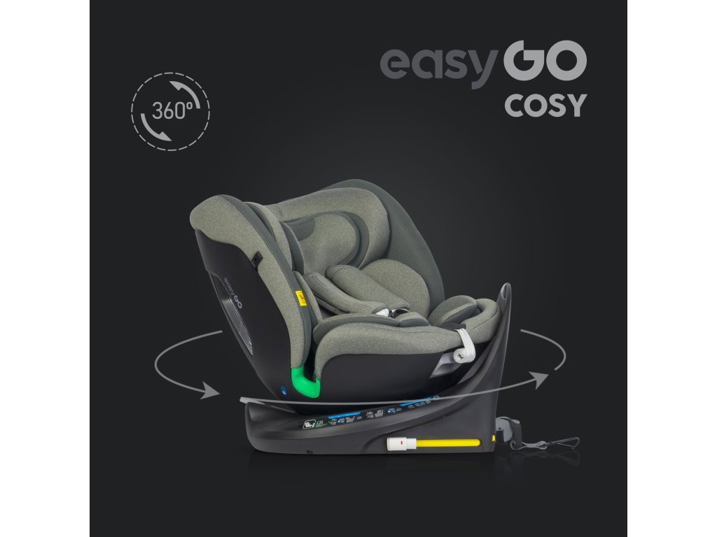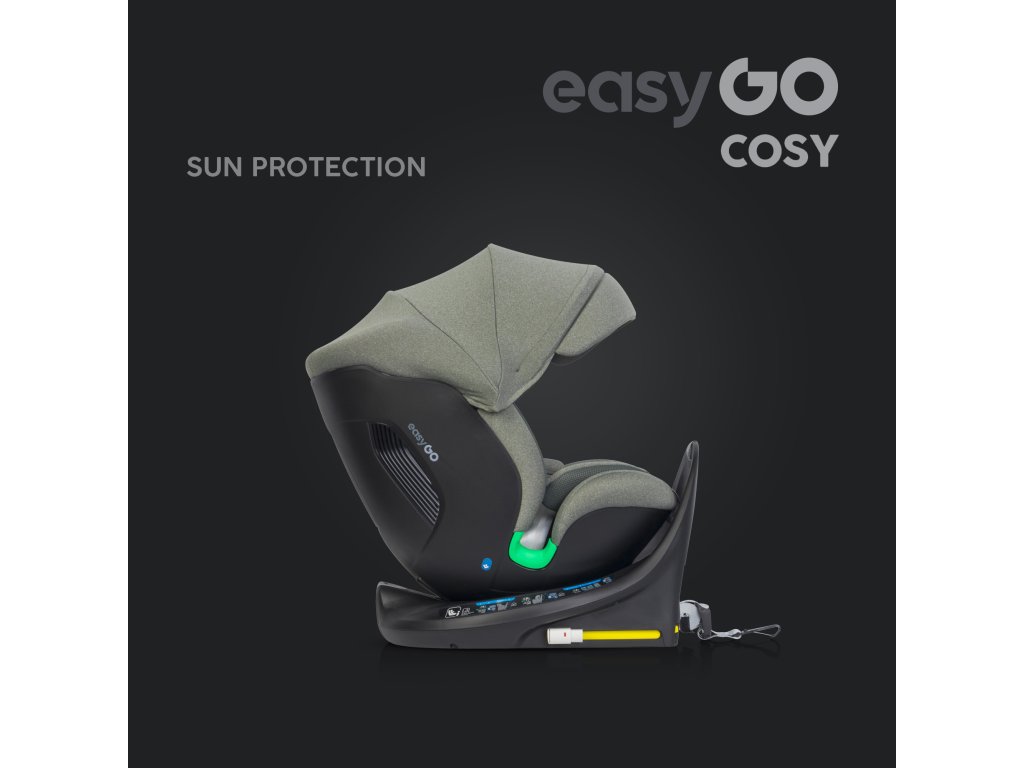 EasyGo COSY otočná autosedačka pro děti od 40 do 150 cm (0–36 kg) ECE R129 I-SIZE s TOP TETHER opaskem a přístřeškem Sedačka COSY od EasyGo je navržena pro děti od 40 do 150 cm (tedy od narození do přibližně 36 kg). Má integrovanou 360° ISOFIX otočnou základnu a HORNÍ LANOVÝ PÁS. Další ochranou je rám s vysokou protirotací.