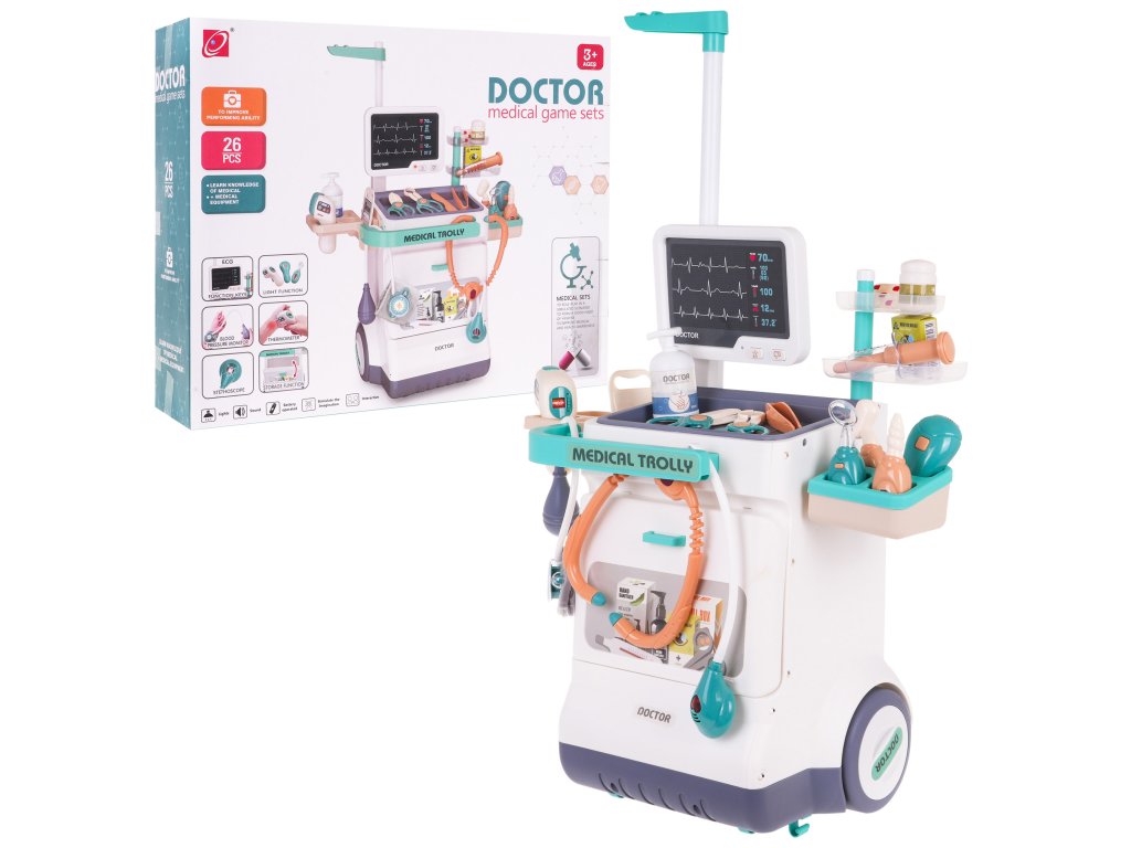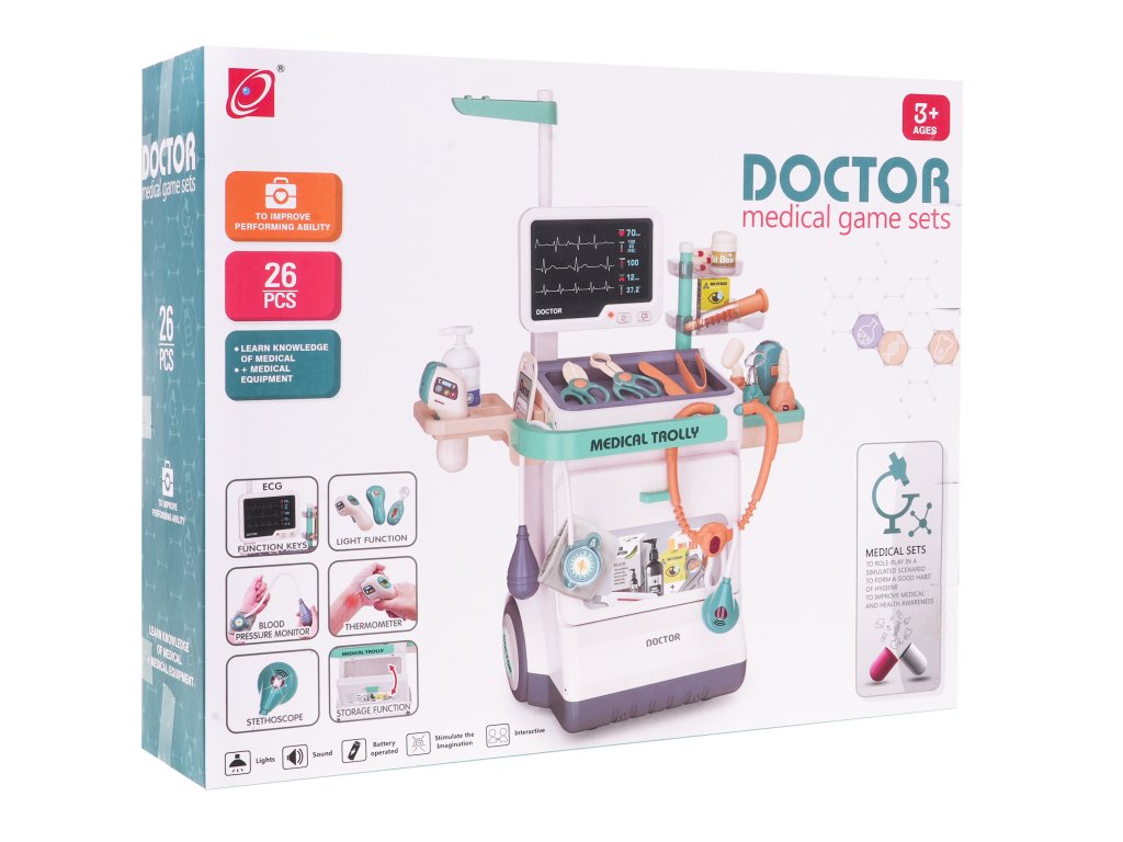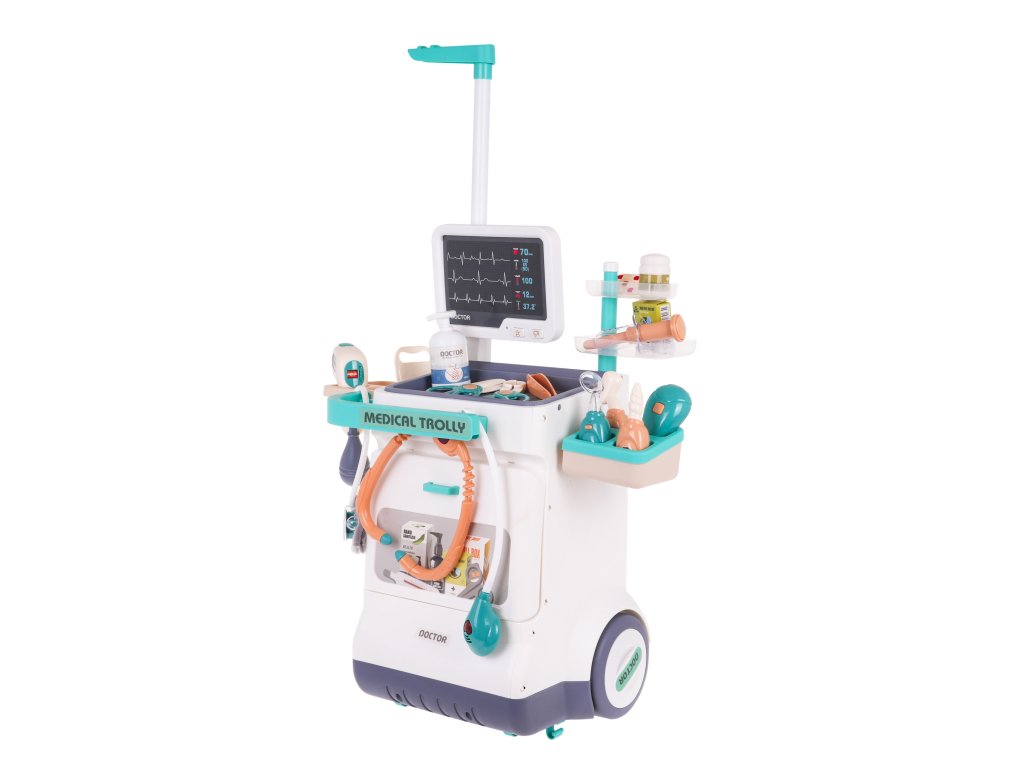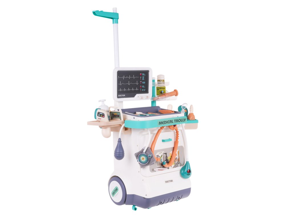 - a large medical trolley with wheels, a measuring cup (handle) and a monitoring screen with an X-ray and ECG panel, - 1 photo of the ECG record, - 3 x-rays; hand, lungs and pelvis, - thermometer, - dental mirror, - dental drill, - stethoscope, - scalpel, - eye chart for reading letters, - blood pressure monitor with pump, - neurological hammer, - syringe, - surgical scissors, - surgical forceps, - tweezers, - dummy medicine bottle, - a dummy bottle with disinfectant liquid, - 5 packages of medicines, - blister with tablets, - patient card, - decorative stickers |