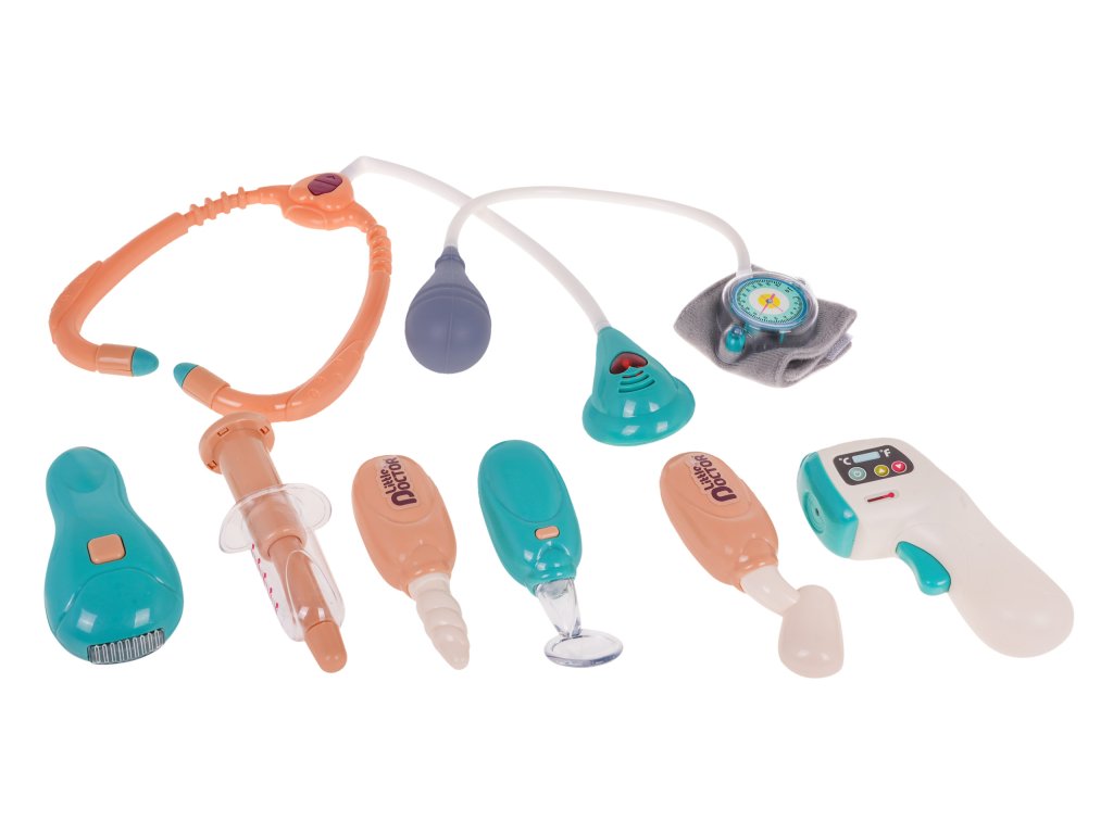 - stroller approx. 46.6 cm x 22 cm x 55 cm (handle lowered), 111 cm (handle raised to maximum), - package approx. 37.3 cm x 12 cm x 46.3 cm, - interchangeable ECG and X-ray photos approx. 15.5 cm x 11.5 cm, - thermometer with temperature adjustment, approx. 11 cm x 6 cm x 4 cm, - dental mirror with backlight approx. 11 cm x 3.5 cm x 2.5 cm, - dental drill 10.5 cm x 3.5 cm x 2.5 cm, - stethoscope with light and sound effects approx. 47 cm x 15 cm, - scalpel approx. 10.5 cm x 2 cm, - ophthalmological card for reading letters, approx. 6.5 cm x 8.5 cm - blood pressure monitor with a pump, approx. 38 cm long, - neurological hammer approx. 11 cm x 3.5 cm x 2.5 cm, - syringe approx. 12 cm x 4.5 cm x 3.5 cm, - surgical scissors approx. 10 cm x 5 cm, - surgical forceps approx. 10.5 cm x 6 cm, - tweezers approx. 10 cm x 2 cm, - dummy medicine bottle approx. 5 cm x 3.3 cm, - dummy bottle with disinfectant liquid, approx. 9 cm x 4.5 cm, - blister with tablets approx. 5 cm x 3.5 cm, - patient card approx. 10 cm x 8.5 cm, - wheel diameter in the stroller: approx. 11.5 cm. |