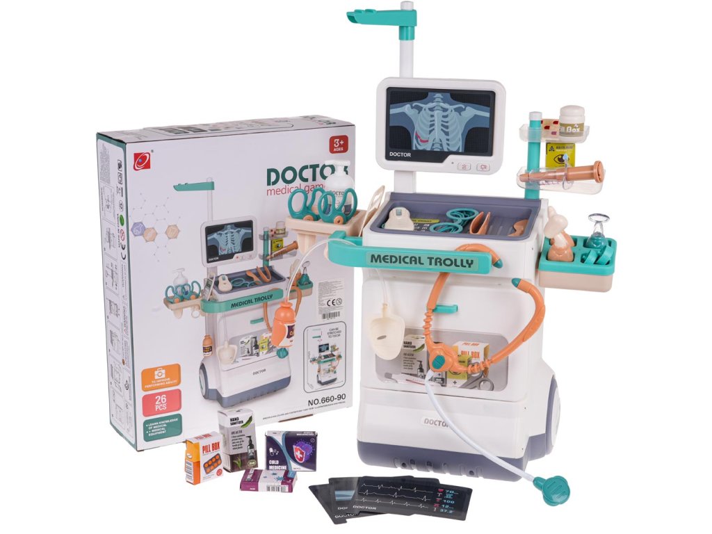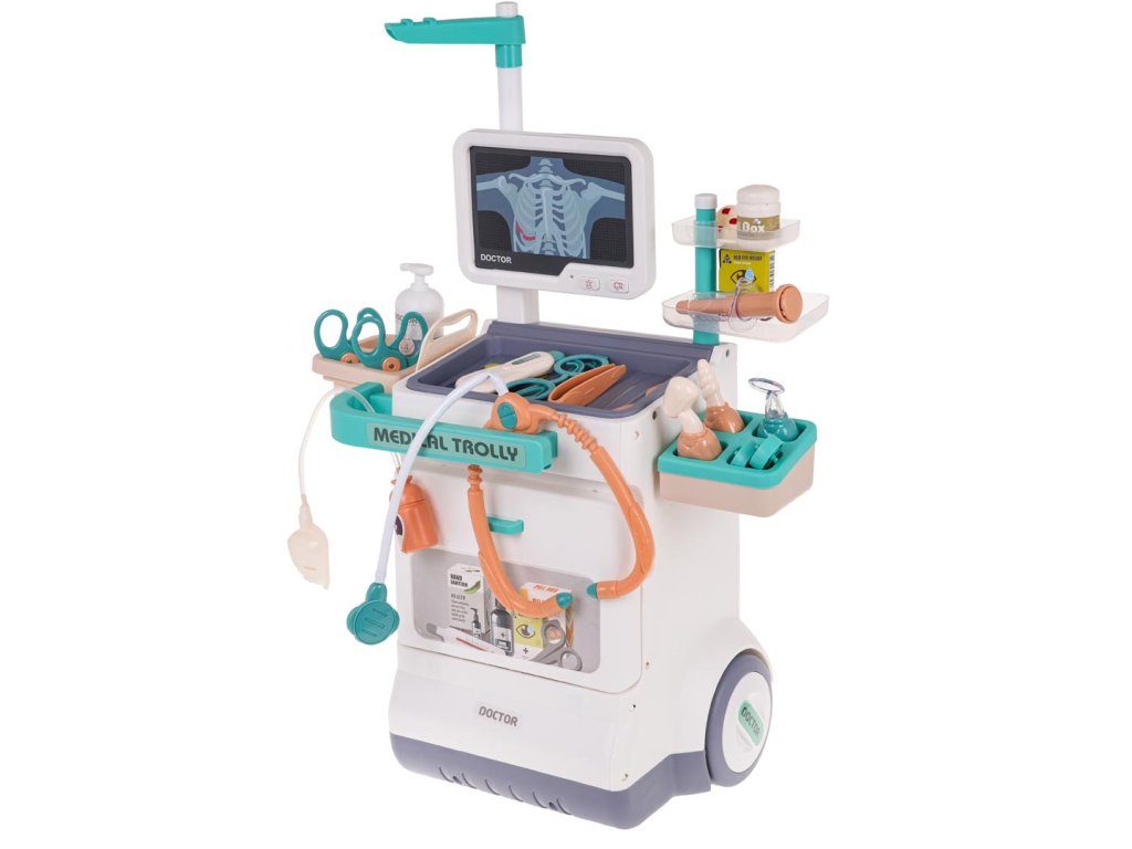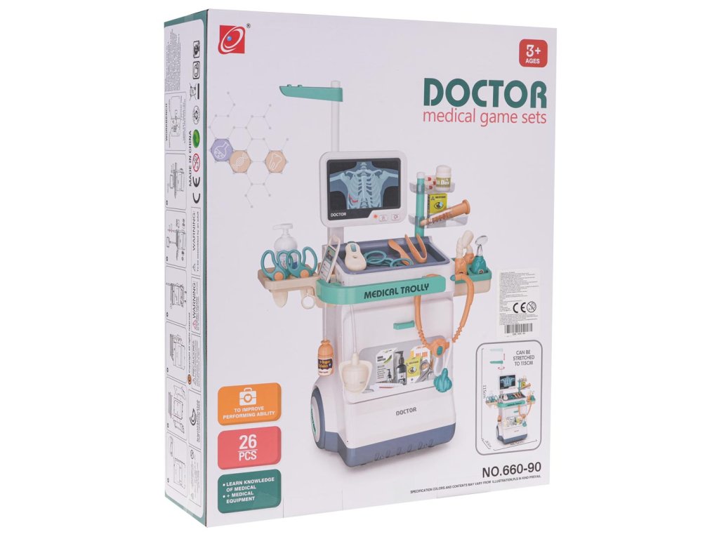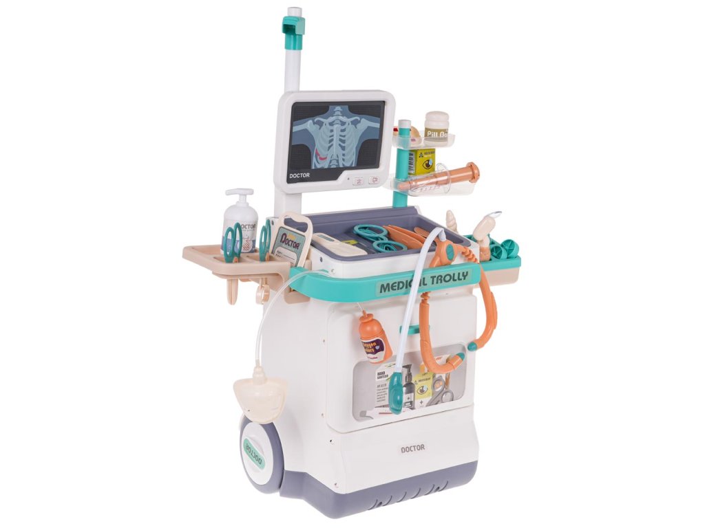 - suitable for children from 3 years of age, - a richly equipped set with lots of accessories, - exquisitely crafted in vivid colours, - has a comfortable handle for pushing, - possibility of changing the height of the handle, - has large wheels, easy to steer, - monitoring panel with heartbeat sounds and alarm and flashing diode, - ability to change ECG and X-ray images, - thermometer with temperature adjustment knob. |