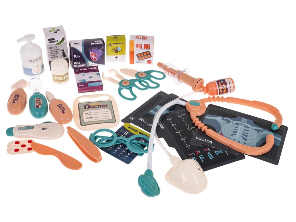 - medical trolley approx. 46.5 cm x 26.5 cm x 115 cm, - ECG and X-ray photos approx. 15.5 cm x 12.5 cm, - thermometer approx. 10.5 cm x 5 cm x 1.5 cm, - dental mirror approx. 11 cm x 3.5 cm x 2.5 cm, - dental drill approx. 10.5 cm x 3.5 cm x 2.5 cm, - stethoscope approx. 47 cm x 15 cm, - scalpel approx. 10.5 cm x 2 cm, - blood pressure monitor with pump approx. 38 cm long, - reflex hammer approx. 11.5 cm x 3.5 cm x 2.5 cm, - syringe approx. 12.5 cm x 4.5 cm x 3.5 cm, - surgical scissors approx. 10 cm x 5 cm, - surgical forceps approx. 10.5 cm x 6 cm, - tweezers approx. 10 cm x 2 cm, - a medicine bottle dummy, approx. 5.5 cm x 3.5 cm, - a dummy bottle with disinfectant liquid, approx. 9 cm x 4.5 cm, - blister with tablets approx. 5 cm x 3.5 cm, - patient card approx. 10.5 cm x 8.5 cm, - glasses approx. 11 cm x 4.5 cm, - wheels in the stroller approx. 11.5 cm in diameter, - packaging approx. 37.5 cm x 12 cm x 46.5 cm. |