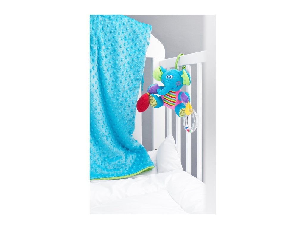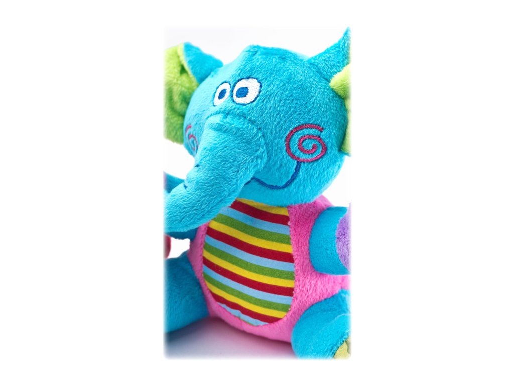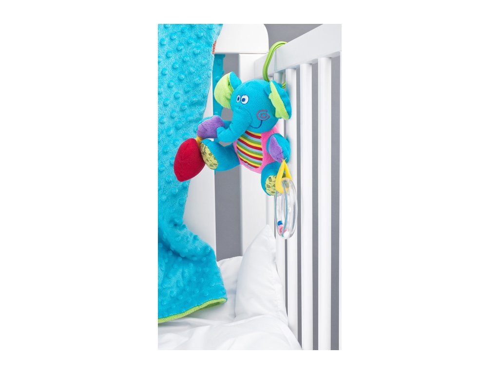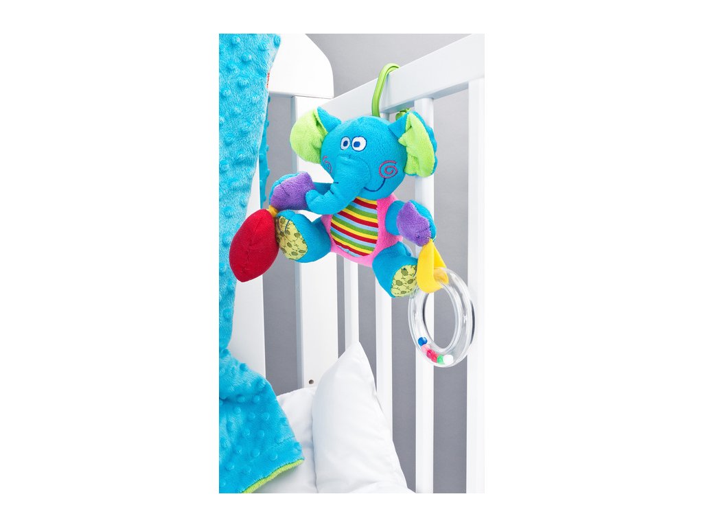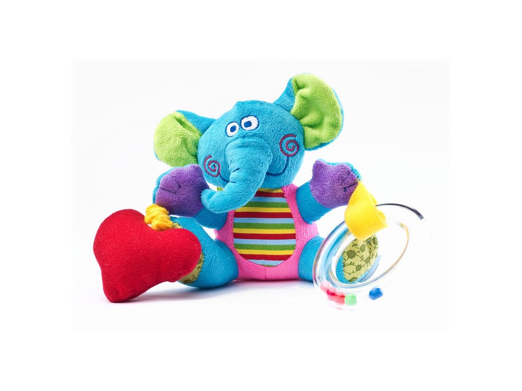Tento geniální slon zná mnoho způsobů, jak absorbovat vaše dítě a určitě se stane jedním z jeho nejlepších přátel! V jedné tlapce drží chrastítko, v druhé vibrující srdce. Kromě toho nohy a uši slona příjemně šustí. Barevné prvky hračky pomohou dítěti naučit se rozpoznávat barvy a praktický přívěsek vám umožní umístit slona na kočárek, postýlku nebo kolébku.