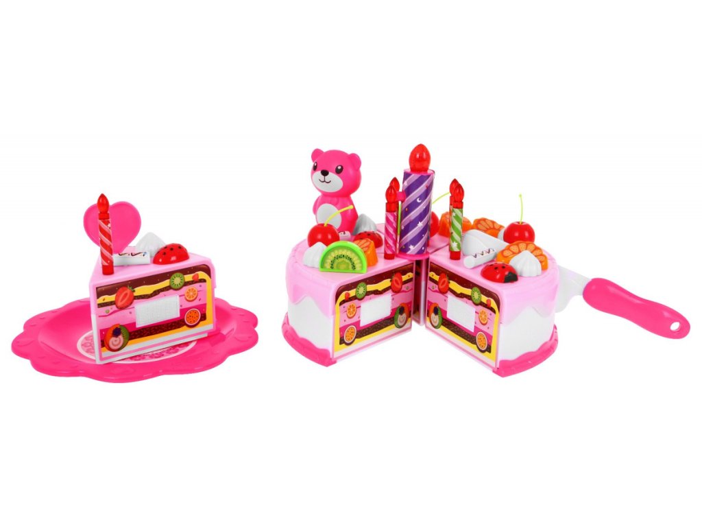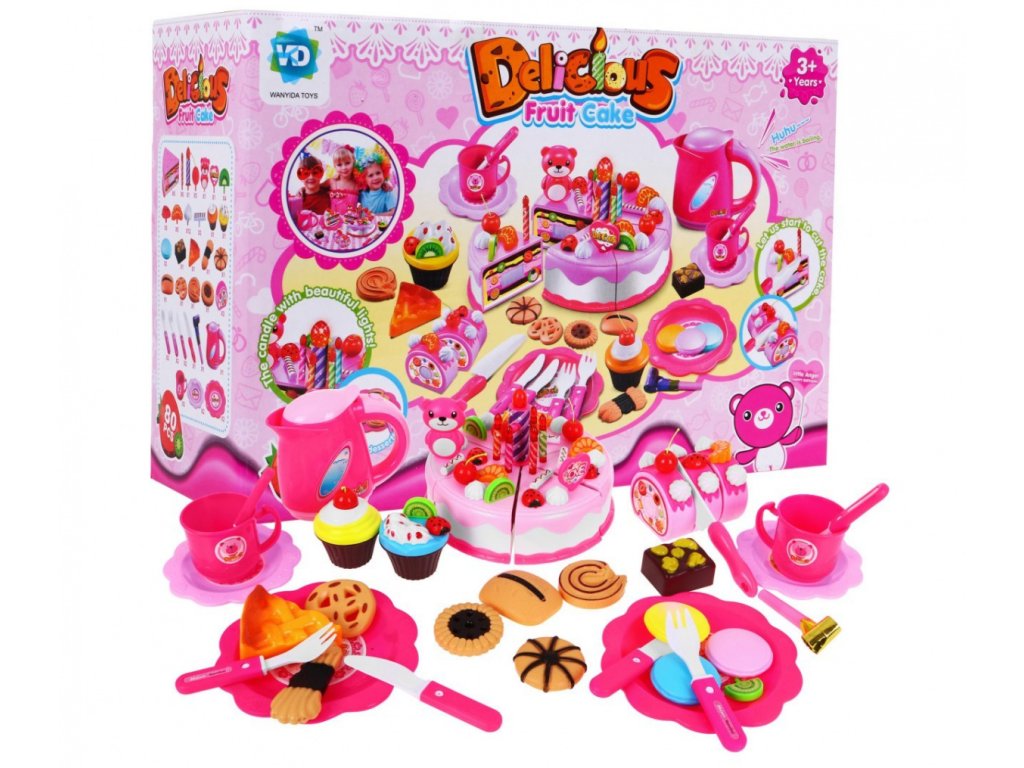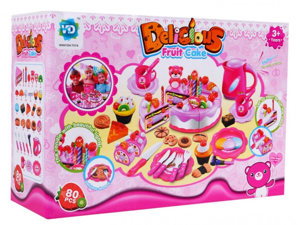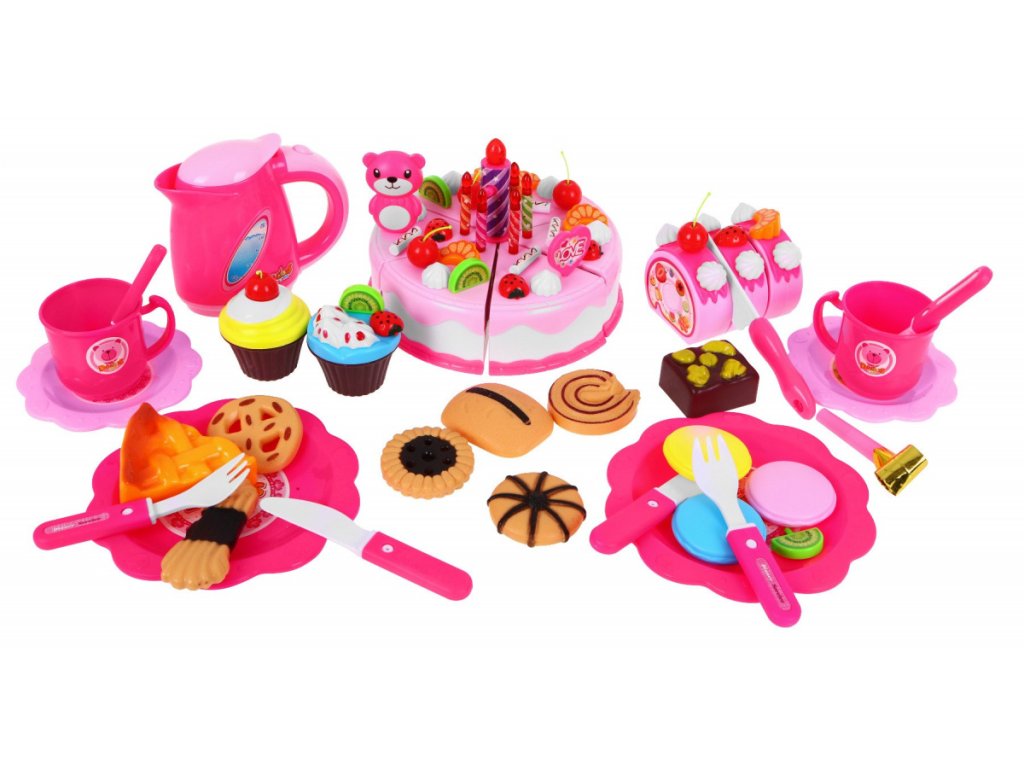 - 6 pieces of cake, - 7 candles, including one larger, shining (about 6.5 cm x 2 cm - a large candle, 4.5 x 0.5 cm - a small candle), - 12 without (about 2 cm x 2 cm), - 5 hangings (about 4.5 cm x 2.5 cm), - bear (about 6.5 cm x 4.5 cm), - 4 kiwis (about 2.5 cm x 2.5 cm), - 5 strawberries (about 2.5 cm x 2.5 cm), - 5 mandarins (about 2.5 cm x 2 cm), - 5 iced sticks (about 2.5 cm x 2.5 cm), - 2 muffins (about 5 cm x 6 cm), - 11 different cookies (various shapes, dimensions approx. 6 cm x 5 cm), - 3 pieces of roulade, - 2 smaller knives (about 11 cm x 2 cm), - a big knife (14 cm x 3 cm), - a set of colored stickers, - 4 plates (small about 10 cm in diameter, large about 14 cm in diameter), - 2 cups (about 5 cm x 8 cm), - 2 forks (about 10 cm x 2.5 cm), - 2 teaspoons (about 10 cm x 2.5 cm), - a kettle (about 10 cm x 12 cm), - whistle. | |