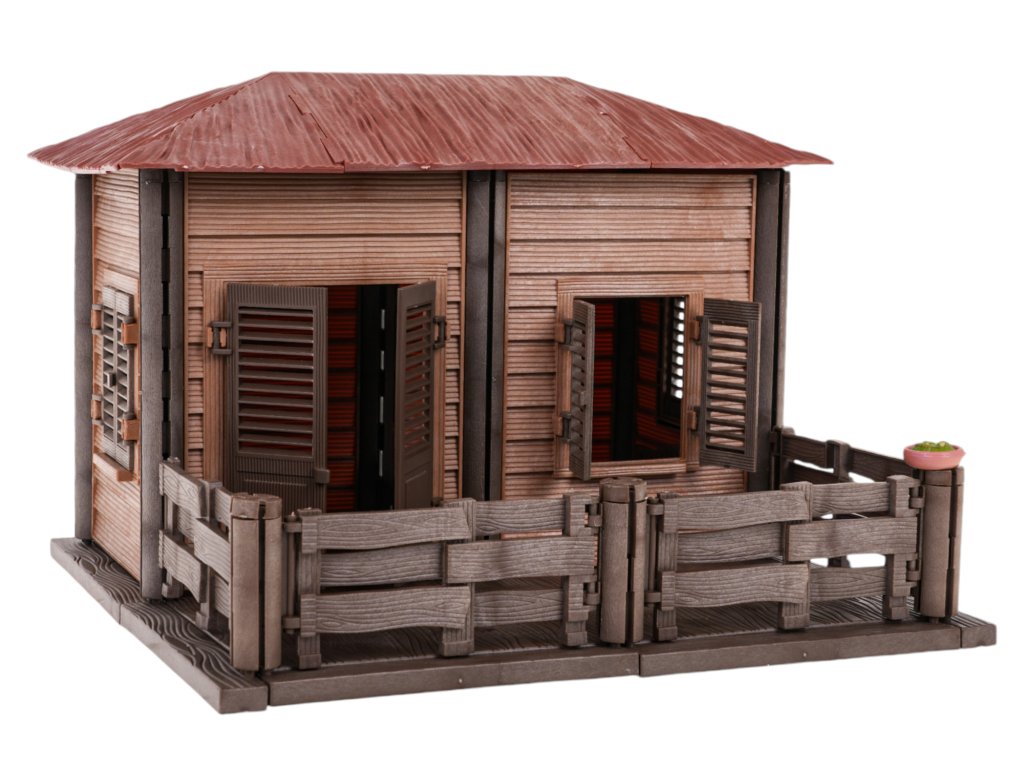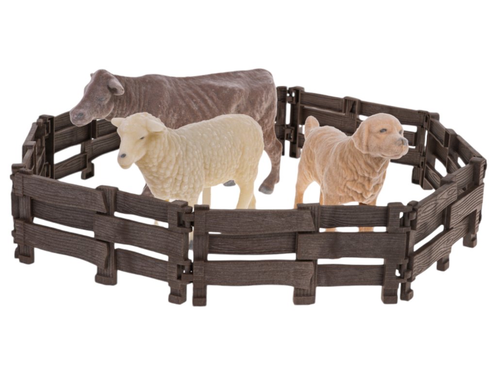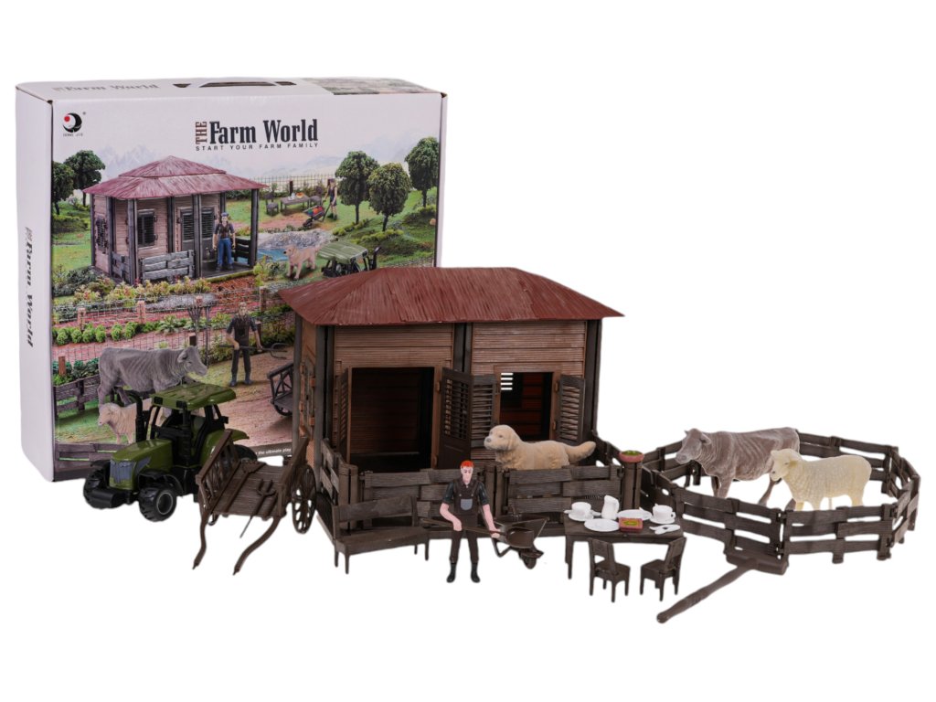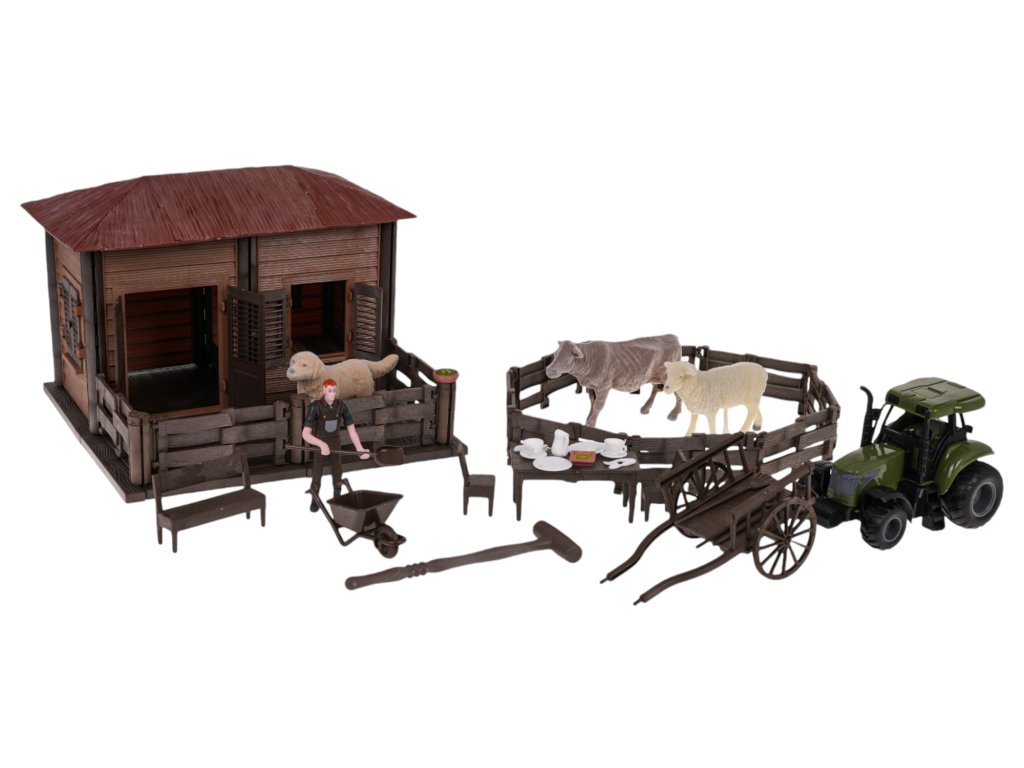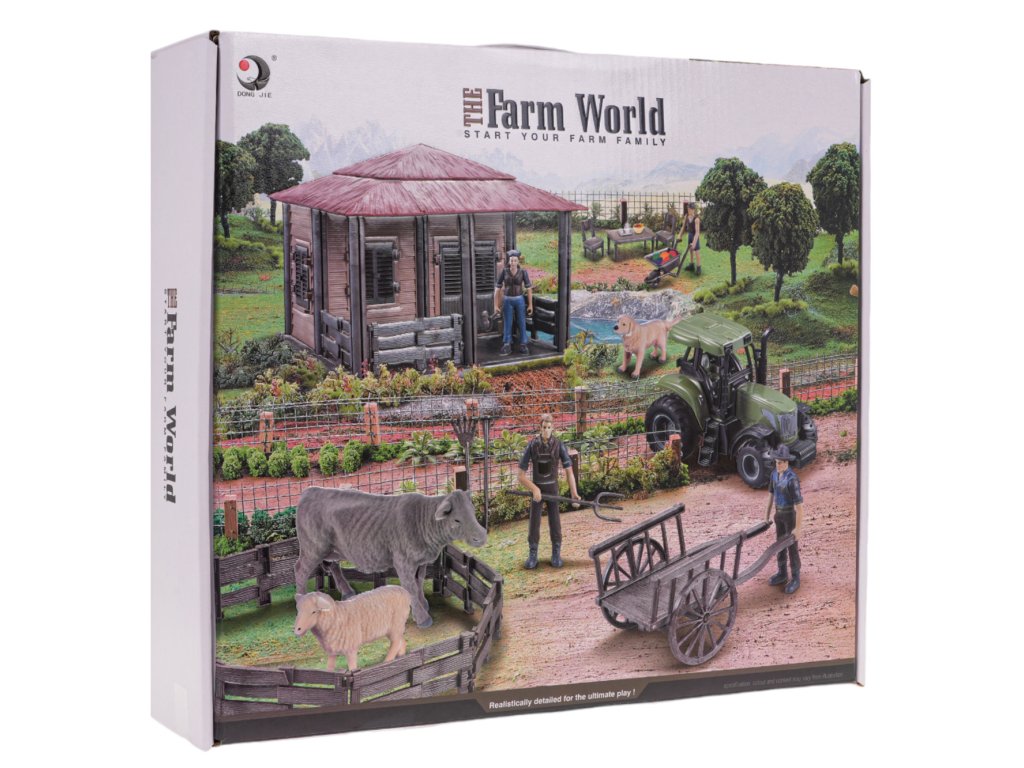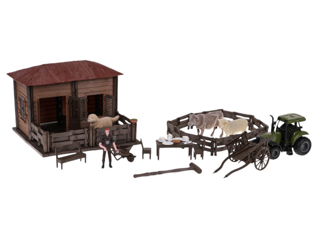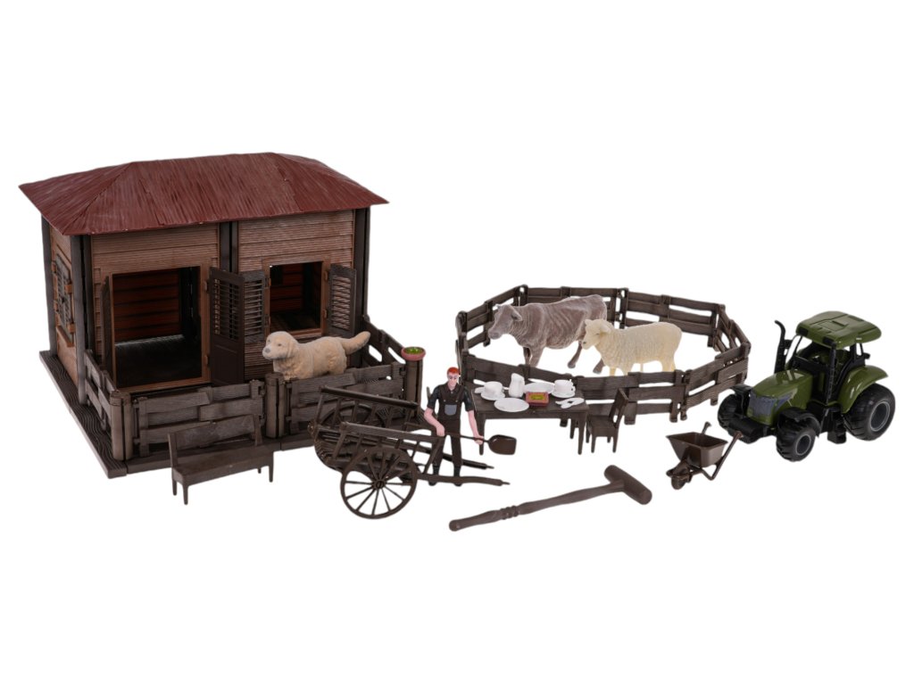 Farm set, farmer's house with tractor and accessories for children from 3 years of age. The set is made of the best quality materials and contains everything you need on a farm. The large farmer's house has a bed inside. In front of the house there is a bench and a cattle pen. In the pen there is a cow and a sheep. There could also be a dog that guards the farm and the most important person on the farm, the farmer. The set also includes a tractor, a hand truck, agricultural tools: a shovel, forks, rakes and wheelbarrows. The set is powered by 3 x AG13 batteries (included). The cow, sheep and dog make sounds characteristic of these animals.