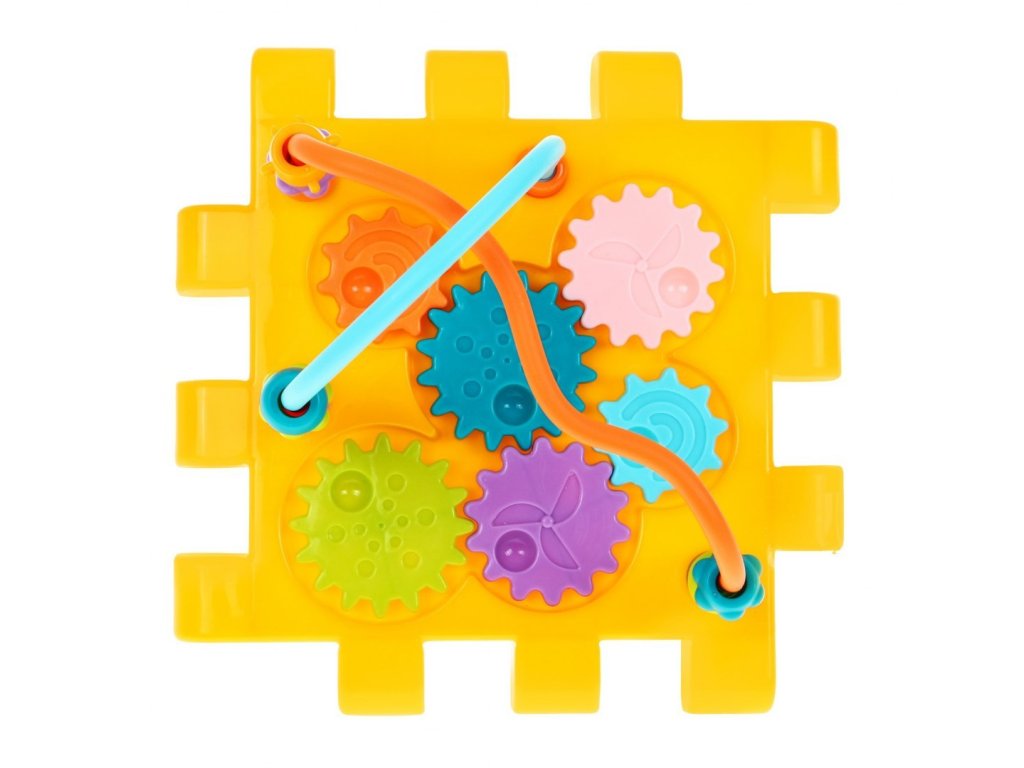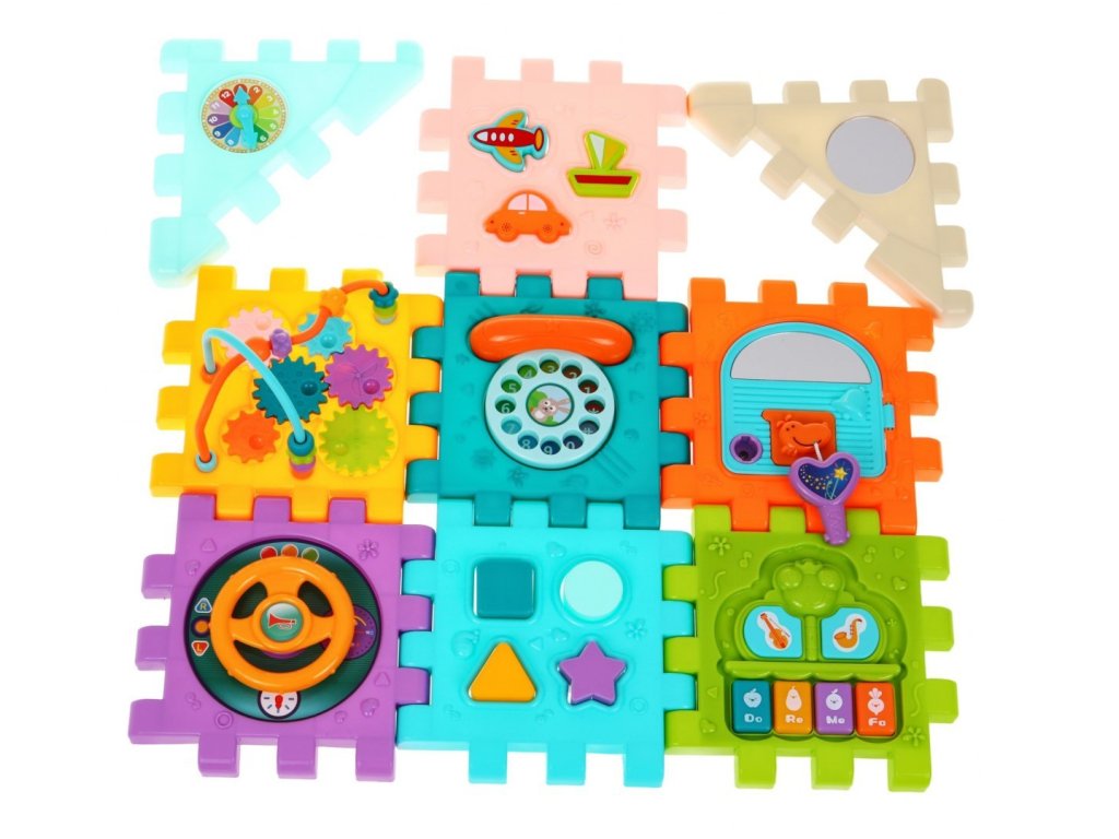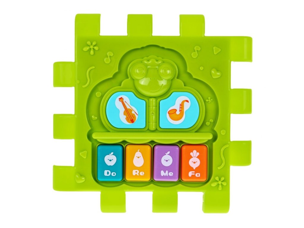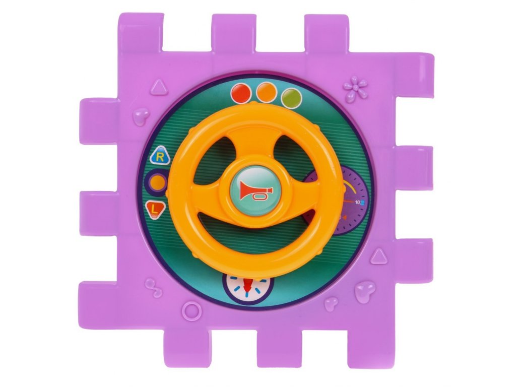 | Amazing, colorful educational cube, puzzle is designed for children from 18 months. The toy is powered by 3 x 1.5 AAA batteries (not included). The blocks can be combined with each other in many different ways, they can be arranged in a flat mat. Each wall has a different color and functionality: 1. A bright green wall with a piano (sounds and lights - hearing and sight). 2. Dark green wall with a telephone (hand and finger training function). 3. Purple wall with the steering wheel (turning the steering wheel and accompanying noises - hearing and training your hands). 4. Orange wall with lockable doors (develops cause and effect thinking). 5. Yellow wall with spinning modes and sliding beads on the track (hand and finger training function). 6. Celadon and pink wall with shape matching (learning colors and shapes). 7. A gray wall with a round mirror (sight), 8. Wall with a watch (training of hands and fingers, sight)The toy has a positive effect on the development of cognitive abilities and cause and effect thinking in a baby. The child will learn new shapes, colors and sounds. Training for his hands will be pressing, pushing and twisting. The toy has sound and light elements that perfectly stimulate the child's eyesight and hearing. |