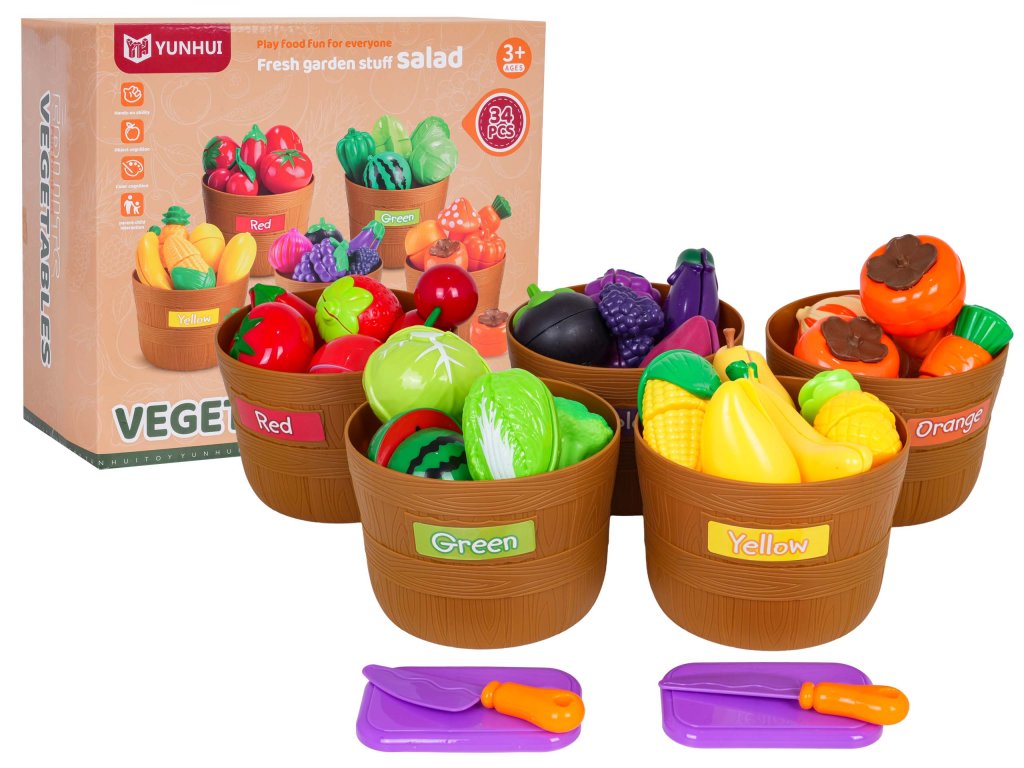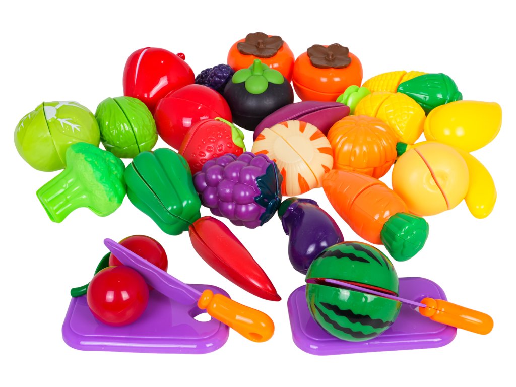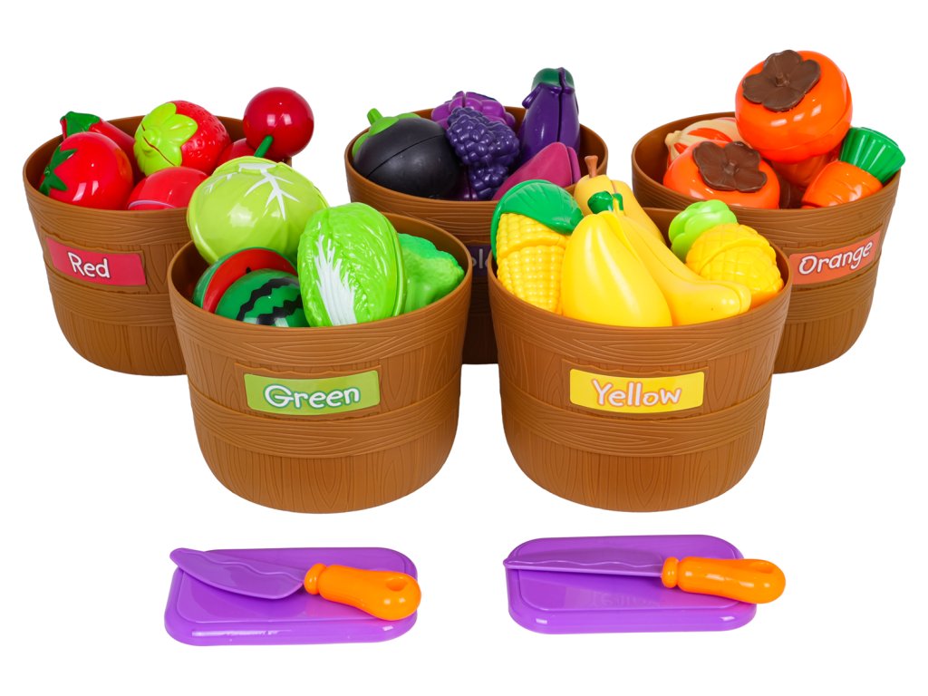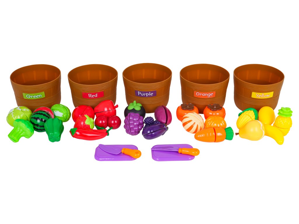 - red fruit and vegetable imitations, e.g. tomato, strawberry, cherry, pepper, apple, - green fruit and vegetable imitations, e.g. watermelon, lettuce, green pepper, 2 x lettuce, - yellow fruit imitations, e.g. banana, lemon, corn, pineapple, - purple fruit and vegetable imitations, e.g. eggplant, 2 x blueberries, - orange fruit and vegetable imitations, e.g. pumpkin, carrot, - 2 x chopping board, - 2 x knife, - 5 x basket for sorting vegetables and fruits. |