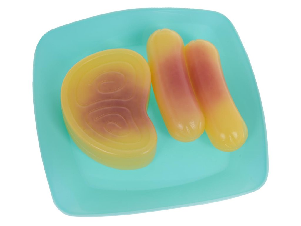 - frying pan with lid approx. 27 cm x 16 cm x 6 cm, - shovel approx. 18 cm x 5 cm x 2 cm, - plate approx. 9.5 cm x 9.5 cm x 1.5 cm, - ketchup dummy approx. 11 cm x 4.3 cm x 2.5 cm, - fish approx. 5.5 cm x 5.5 cm x 3 cm, - sausages approx. 6 cm x 3 cm x 1.5 cm, - steak approx. 5.3 cm x 4 cm x 1.5 cm, - packaging approx. 31 cm x 25.7 cm x 7 cm. |