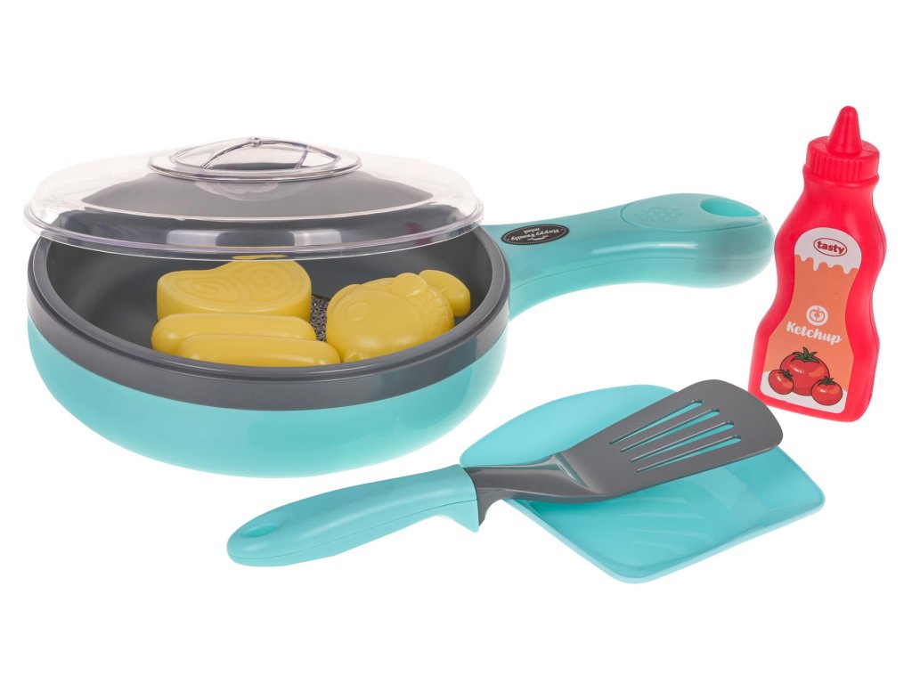 Interactive frying pan with sound and light function for children from 3 years of age. The set includes a frying pan with a lid, spatula, plate, ketchup, fish, sausages and steak. The frying pan is powered by 2 x AAA 1.5 V batteries (not included). After installing the batteries and turning on the toy, you can hear frying sounds and the inside of the pan lights up. 3 diodes, which are responsible for heating the products, and thanks to this, the products change color and look baked.