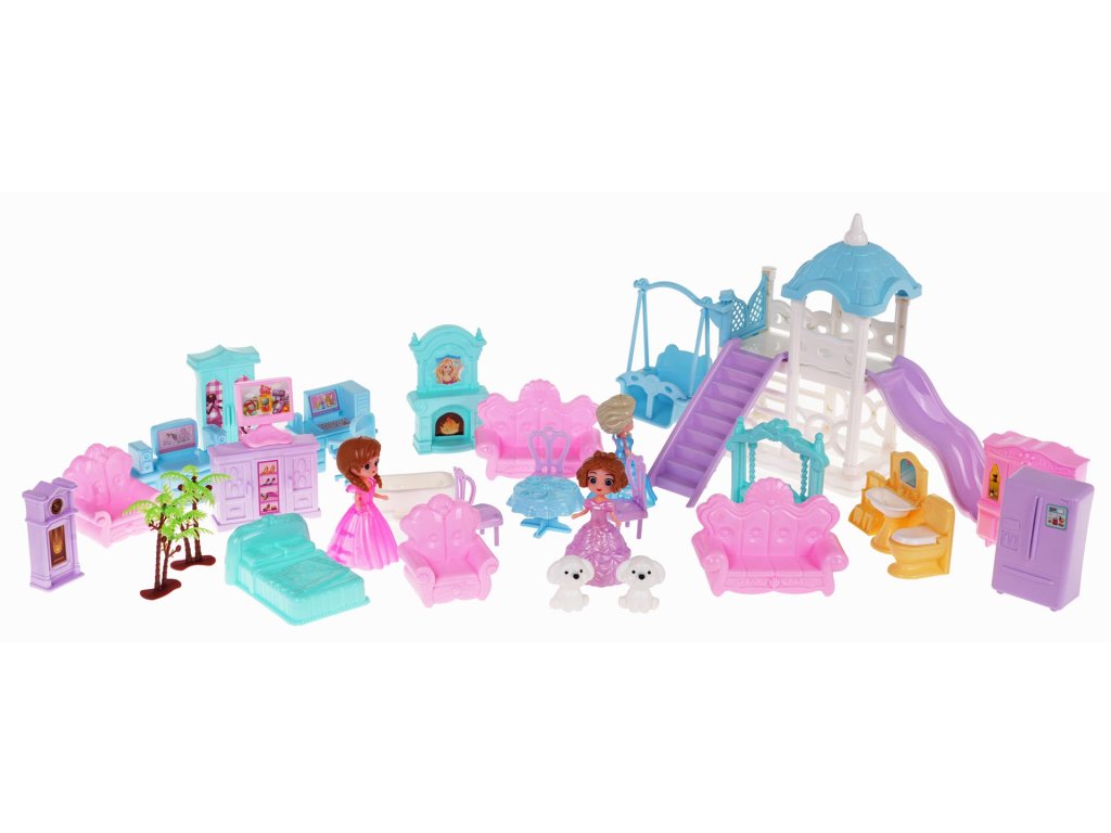 - construction elements of the house, - cottage equipment: * bathroom set with toilet and washbasin, * bathtub, * 2 x sofa, * 2 x armchair, * bed, * fireplace, * refrigerator, * swing, * clock, * desk with computer, * table, * chest of drawers with TV, * large chest of drawers, * TV set, * Wardrobe, * cupboard, * office chair, * 3 x chair, * lamp on stand, - 3 princess figurines, - playground with swing and slide, - 2 dog figurines, - 2 trees, - instructions, - decorative stickers. |