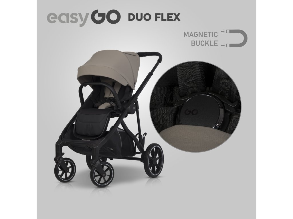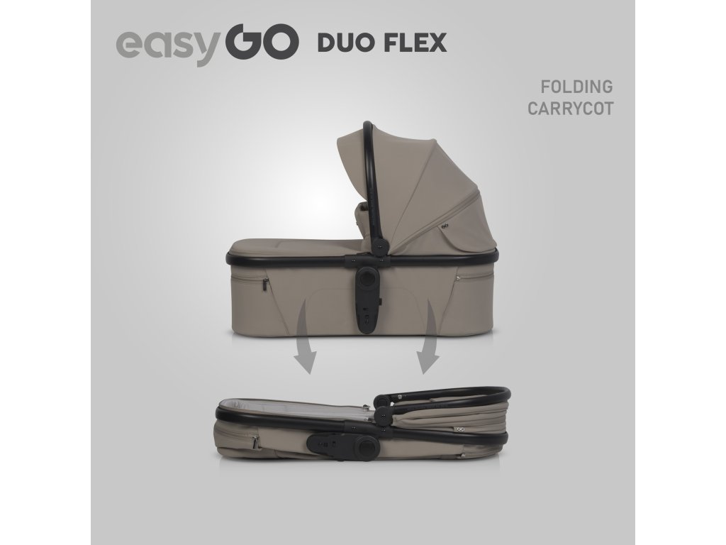 Přepravka kočárku DUOFLEX je velká (77 cm) a má až 3 uzamykatelné ventilační panely zakončené síťovinou, díky čemuž bude fungovat po celý rok. Velký sluneční baldachýn se skládacím baldachýnem lze díky další odnímatelné části naklonit dopředu. Sedačka kočárku DUOFLEX od EasyGo je navržena pro děti do hmotnosti 22 kg.