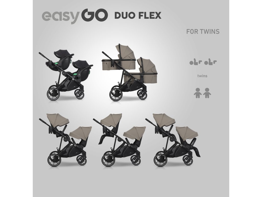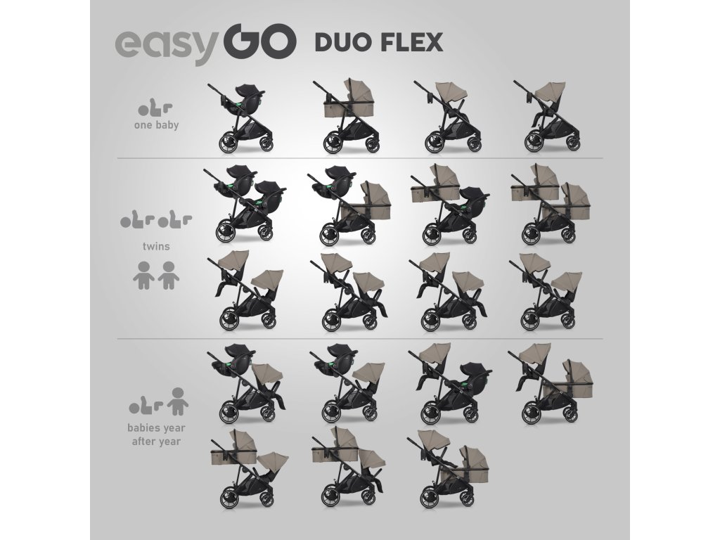 Stačí si objednat verzi se dvěma přepravkami a dvěma sedadly. EasyGo DUOFLEX snadno pojme 2 velké přenosné postýlky nebo 2 autosedačky pro děti o velikosti 40 až 87 cm, a když děti začnou sedět samy, můžete nainstalovat dvě velká sedadla pro kočárek. Sedadla si můžete nastavit v libovolné konfiguraci: čelem k sobě, vpřed, nebo tak, aby děti byly otočené k sobě.