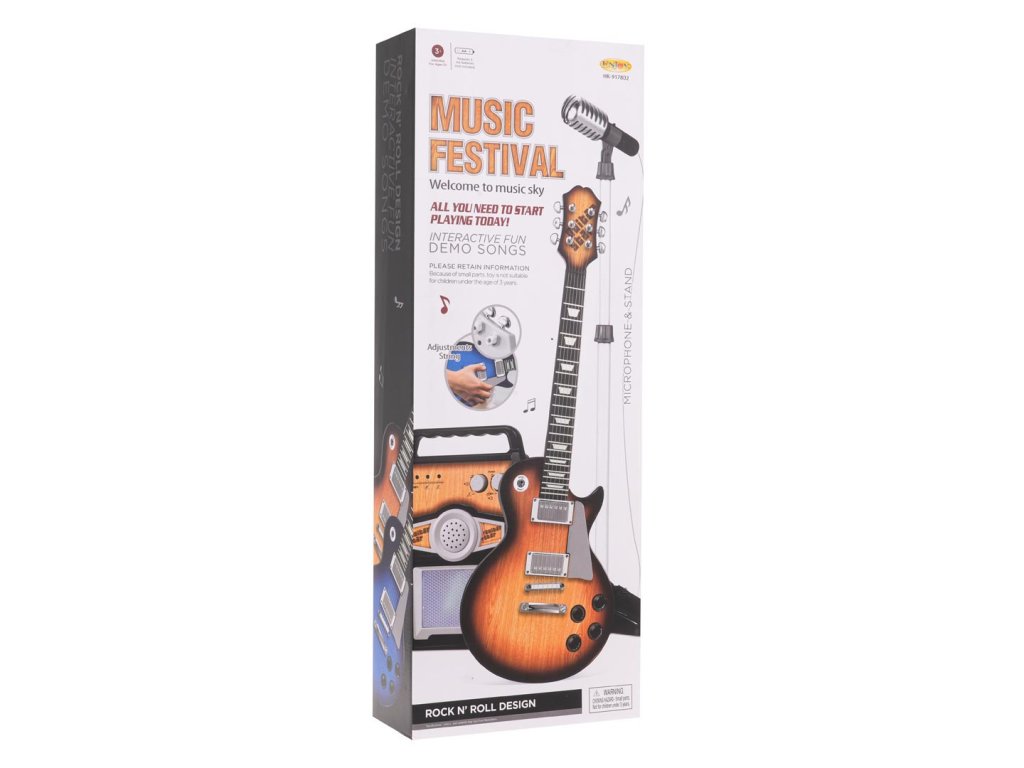 Electric guitar with amplifier and microphone on stand, for children from 3 years of age. The guitar has volume control, various rhythms and ready melodies. The toy is powered by 3 x AA 1.5 V batteries (not included). The amplifier allows you to connect a guitar, microphone, you can also connect a device with MP3 melodies. On the amplifier, there are knobs for adjusting the volume of the guitar and the voice in the microphone, at the bottom colored lights blink in rhythm with the melody. The amplifier is powered by 3 x AA 1.5 V batteries (not included). The microphone stand can be adjusted up and down.
