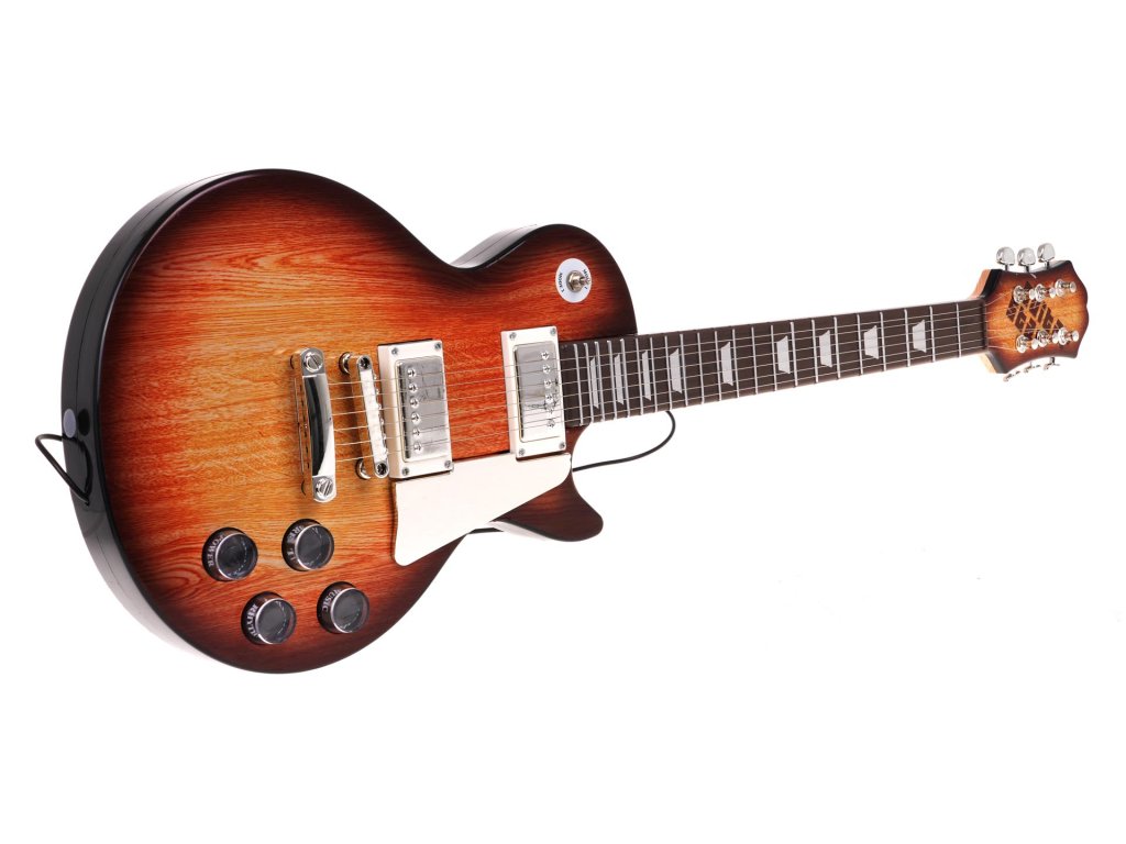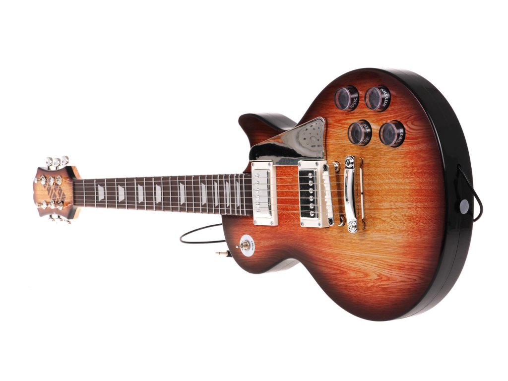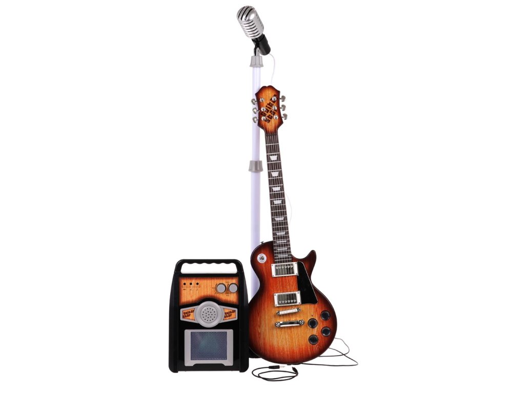 - brown electric guitar, - microphone stand, - microphone with sound system, - amplifier amp, - belt, jack cable . |