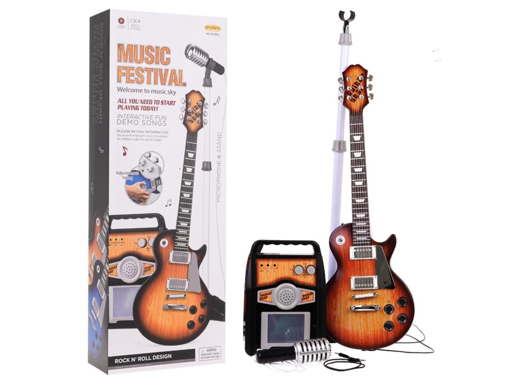 - suitable for children from 3 years of age, - looks like a real instrument, - exercises fingers, develops a sense of rhythm, - adjustable microphone stand, - microphone with delicate sound amplification, - volume control, rhythm selection, ready-made background music. - amplifier with microphone and guitar volume knobs and input for guitar, microphone and MP3 device, - lights flashing to the rhythm of the music on the amplifier. |