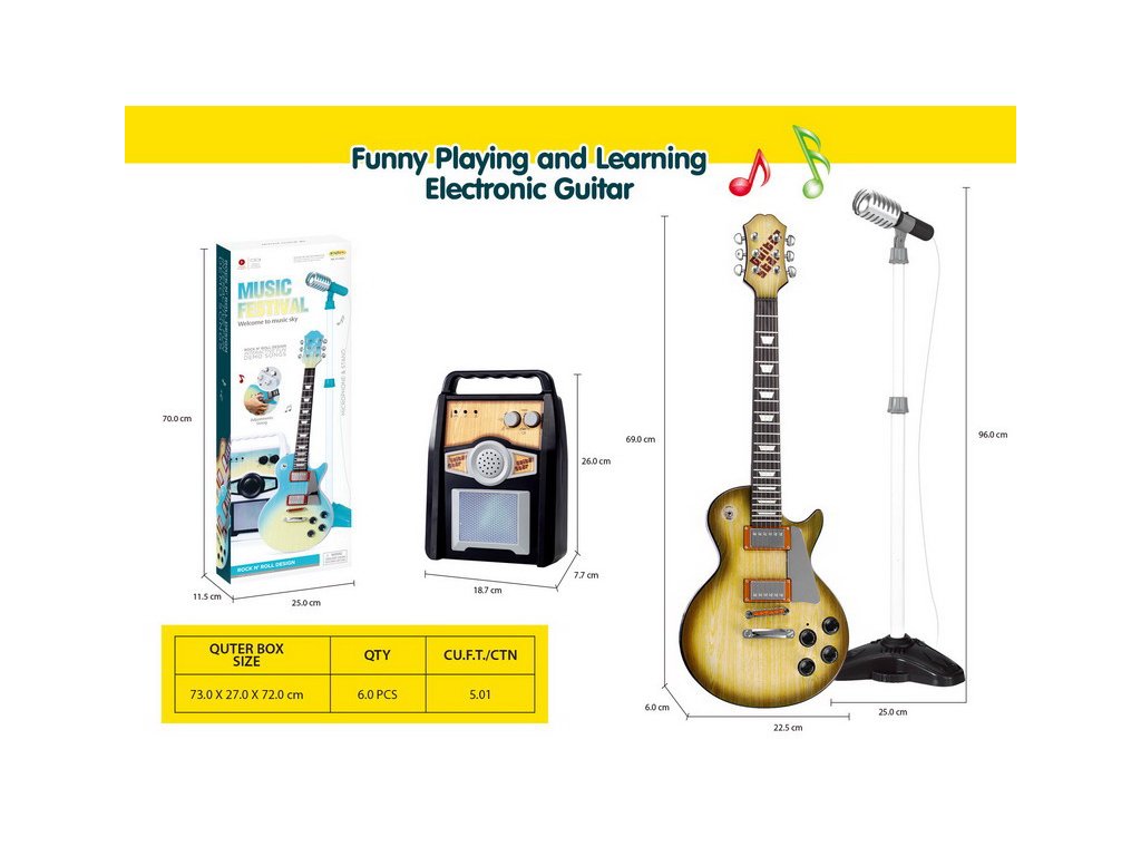 - electric guitar approx. 69 cm x 23 cm x 5 cm, - strap length approx. 99 cm, - microphone stand, adjustable height min. 57 cm, max. 95 cm, base approx. 24.5 cm x 22 cm, - microphone approx. 17 cm x 4.5 cm x 5 cm, - oven approx. 27 cm x 19 cm x 7.5 cm, - packaging approx. 70.5 cm x 26 cm x 11.5 cm. |