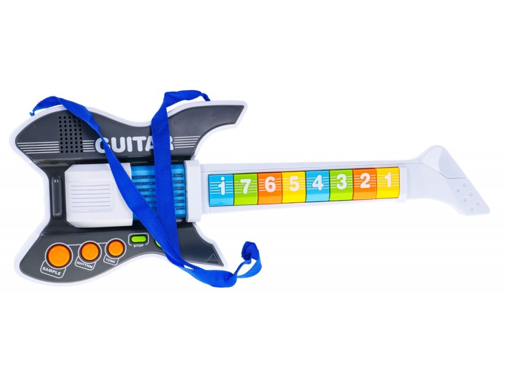 Functions | - button with an on / off switch, - stop button stops the music, - the "sample" button plays 8 demo songs, - the "rhythm" button plays 8 guitar rhythms, - the "tone" button is 3 different guitar sounds, - buttons 1,7,6,5,4,3,2,1 are used for gaming, - colorful lights on the guitar blink during the game, - shoulder strap. |