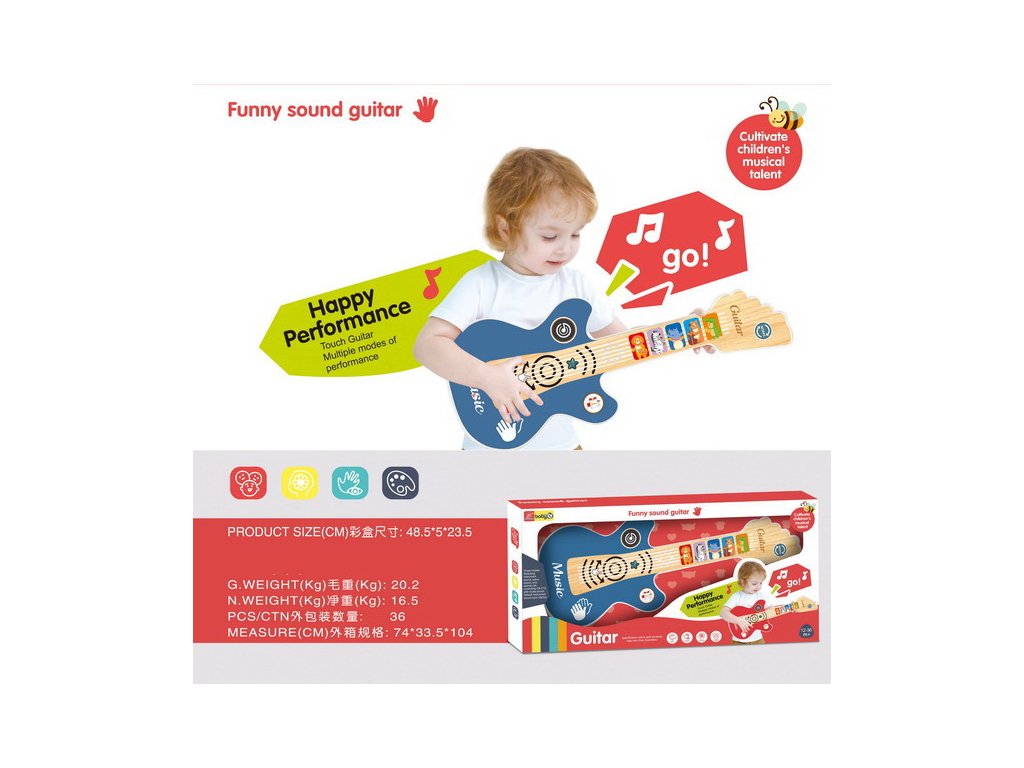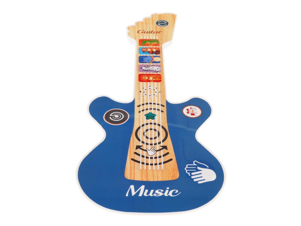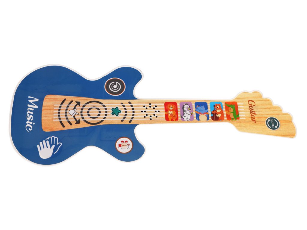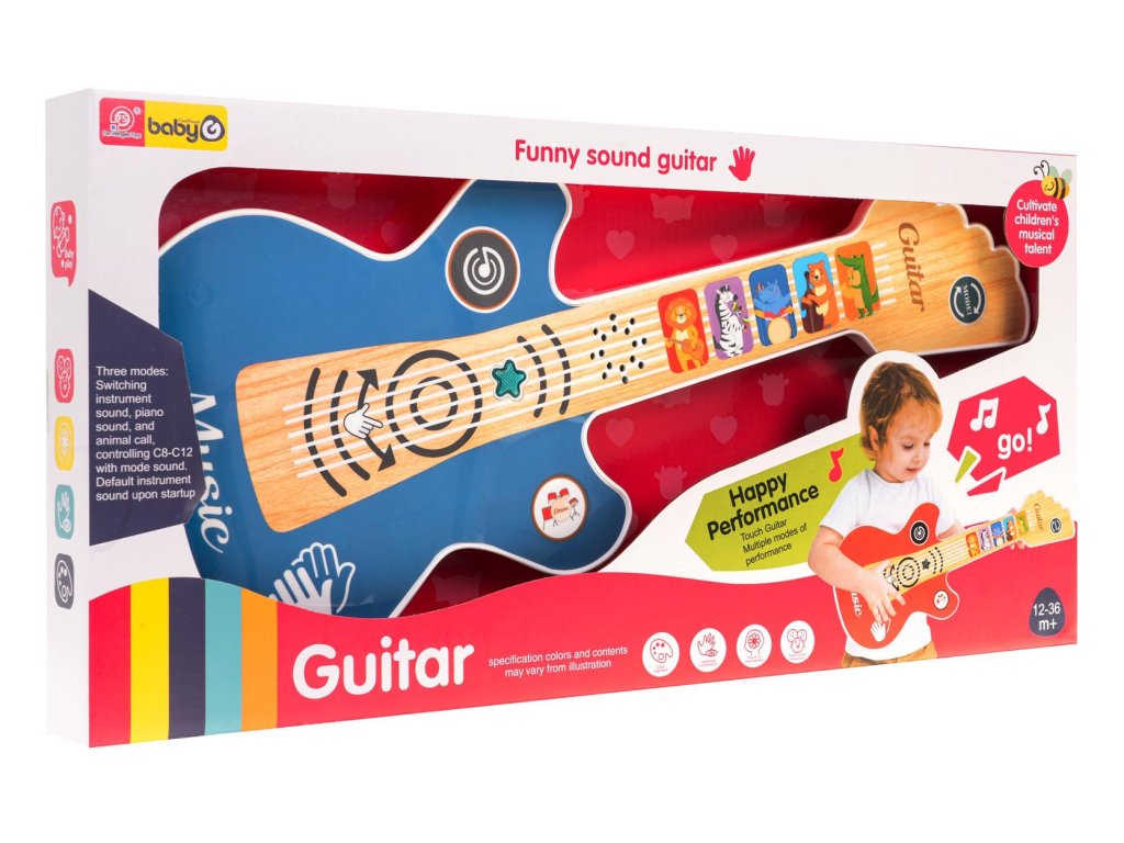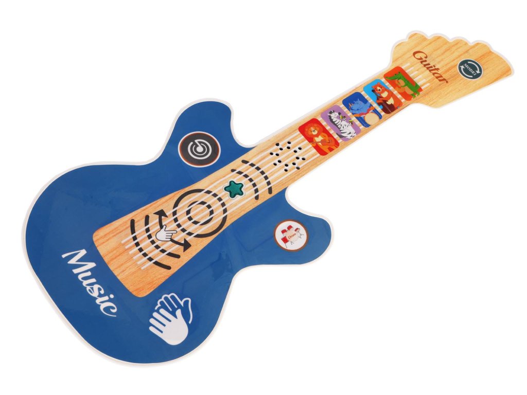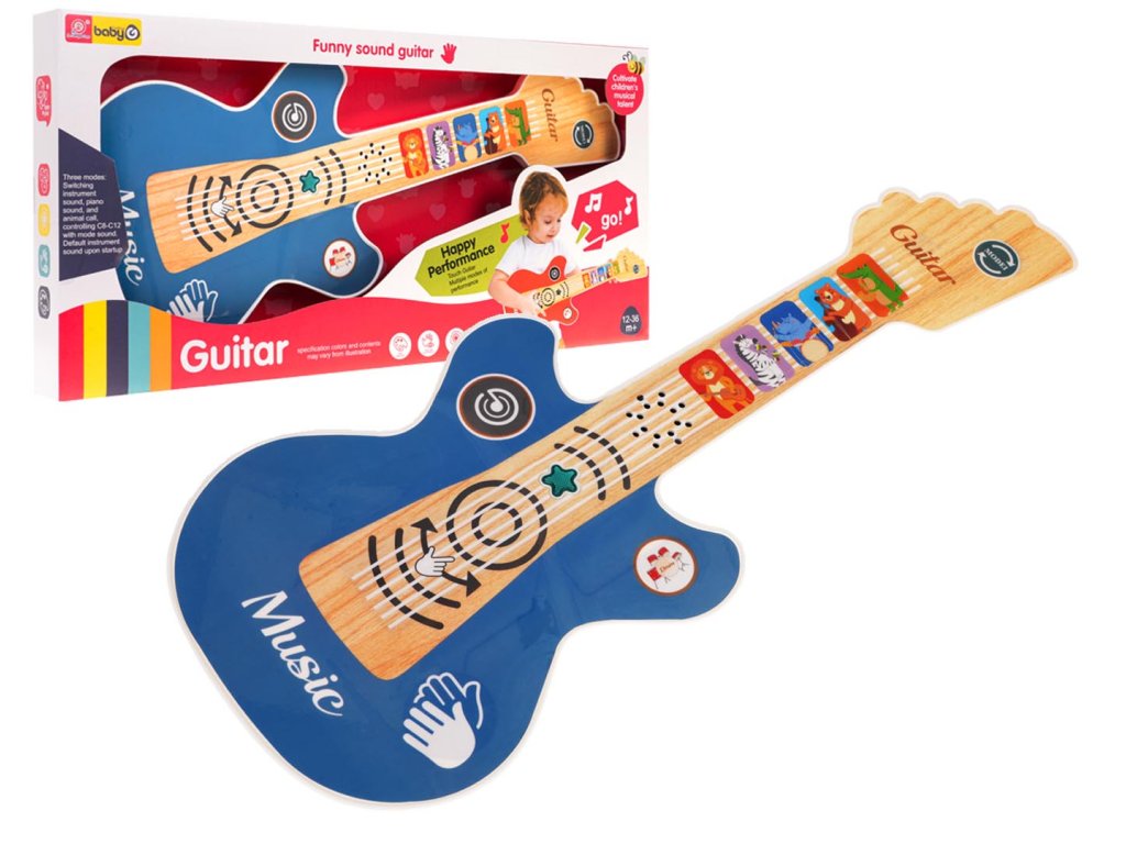 Electric guitar for children over 12 months of age. The guitar is made of the best quality materials, it is light and colorful. The baby has 11 different melodies (touch button with a note), 2 backing tracks with percussion (touch button with percussion) and applause sounds (touch button with handles) at his disposal. On the top of the guitar there is a round touch button that changes the functions of the touch buttons with animals (lion, zebra, hippopotamus, bear and crocodile). In the first mode we hear the sounds of guitar, drums, violin or saxophone. In the next mode, by pressing the animals we can play do-re-mi-fa- sol , and in the next one we will hear the sounds of animals. After pressing any of the touch buttons, the star in the middle of the guitar blinks. The toy is powered by 3 x AA 1.5 V batteries (not included).