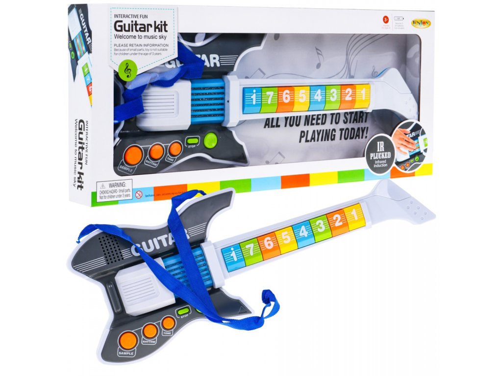 | - button with an on / off switch, - stop button stops the music, - the "sample" button plays 8 demo songs, - the "rhythm" button plays 8 guitar rhythms, - the "tone" button is 3 different guitar sounds, - buttons 1,7,6,5,4,3,2,1 are used for gaming, - colorful lights on the guitar blink during the game, - shoulder strap. |