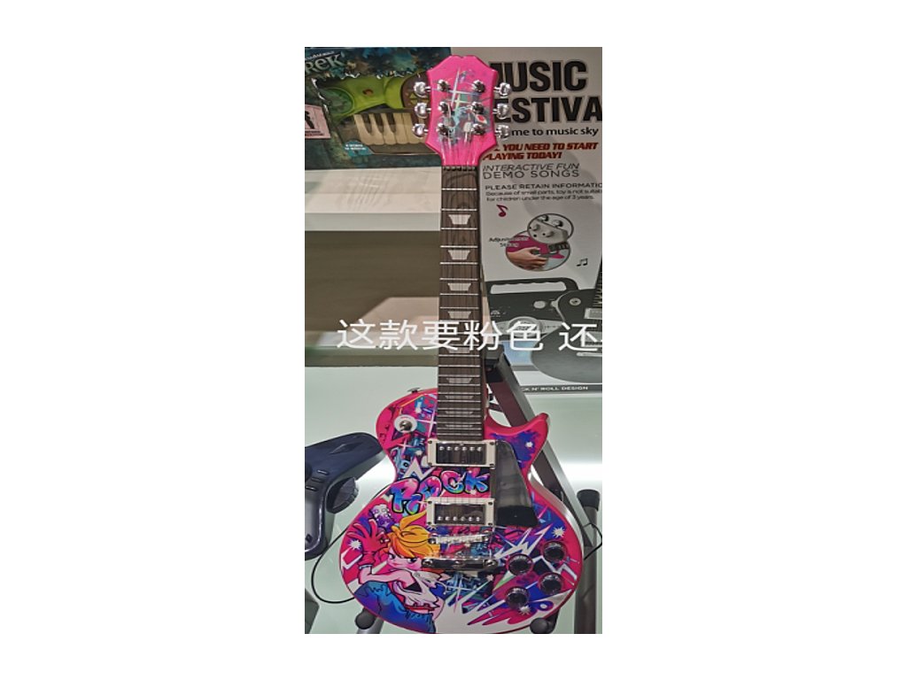 This pink electric guitar is suitable for children aged three and up. It features volume control, various rhythms, sound effects, and eight preset melodies. The toy is powered by 3 x AA 1.5V batteries (not included).