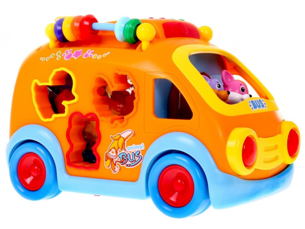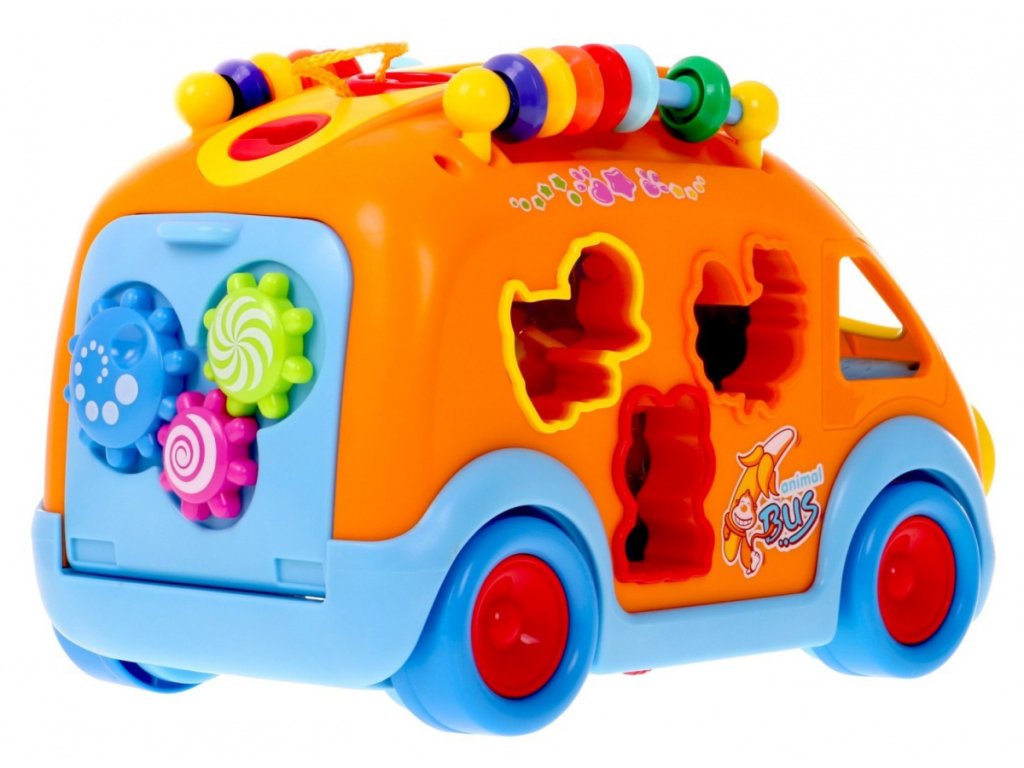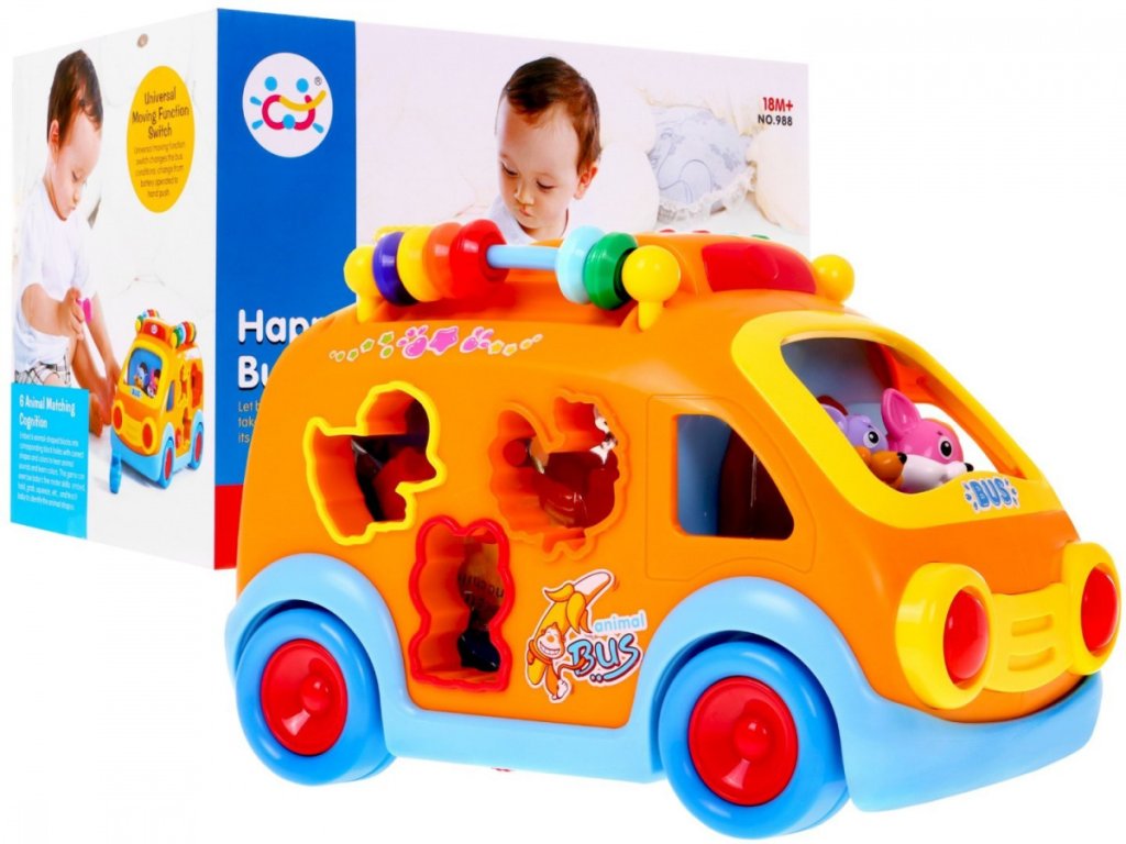 - button enabling and disabling the driving option, - volume control, - built-in soundtrack (9 merry melodies), - colorful beads for sliding, located on the roof of the toy car, - glowing - flashing front lights, - merry rattling gears creating a simple mechanism, - a large flap opened by means of a large key in order to extract the dropped blocks, - sorter - animal shaped holes and matching inserts. | |