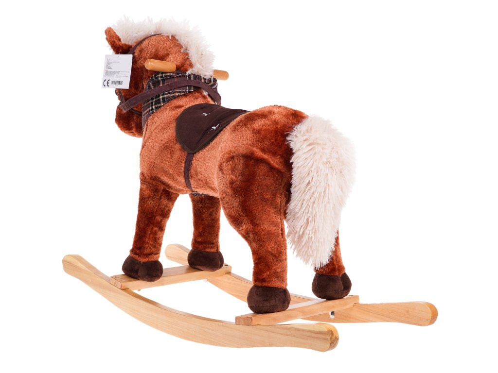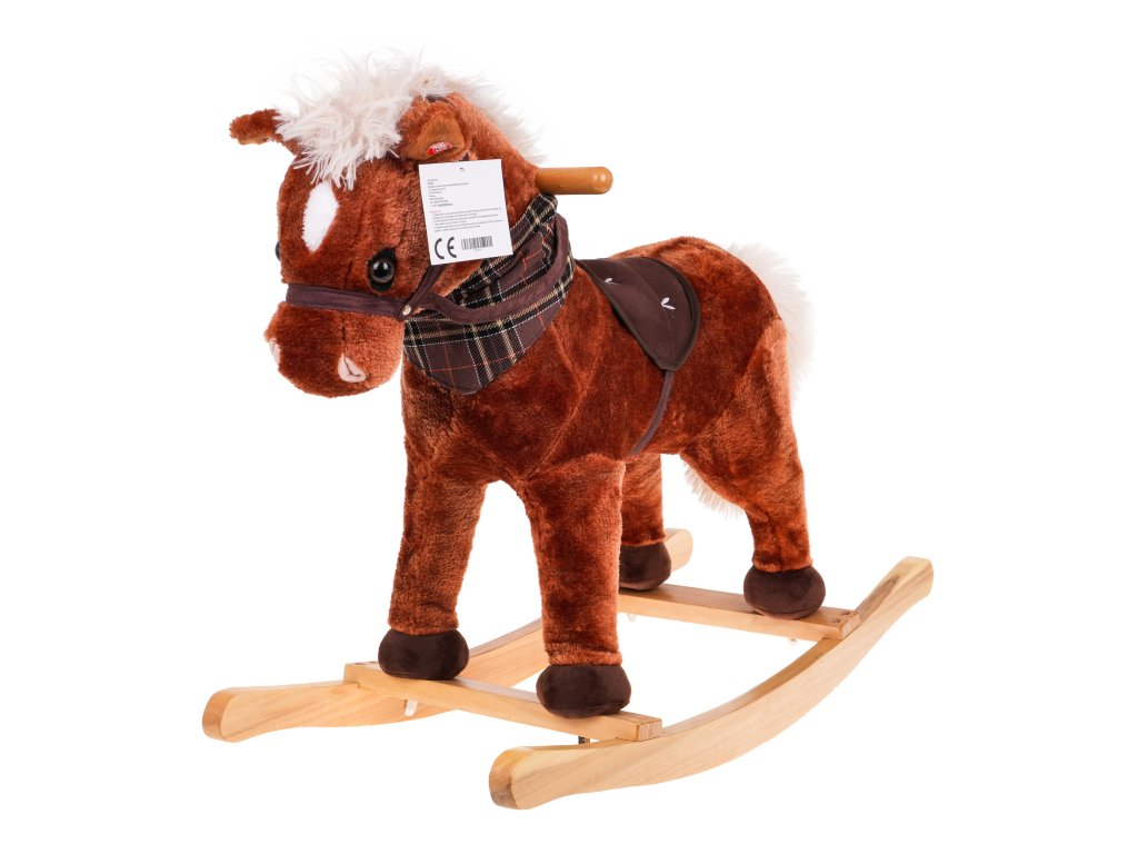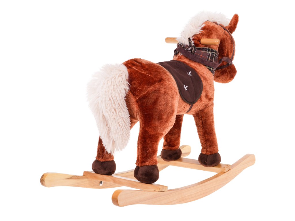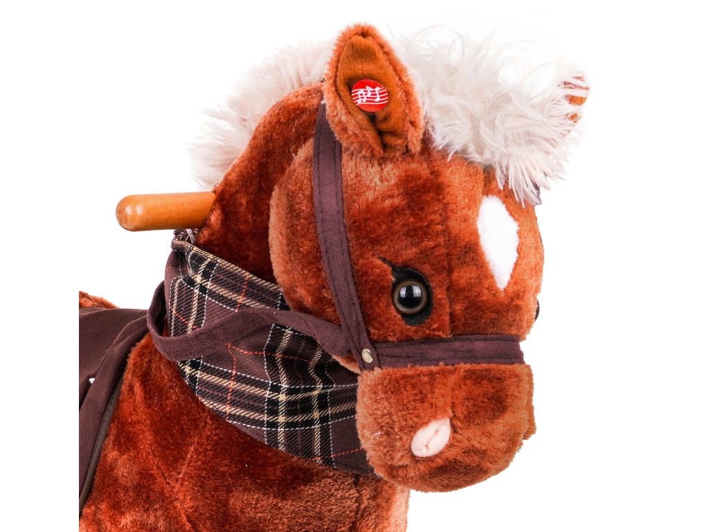 - sounds: neighing and gallop, - made of pleasant-to-touch material, - has safe wooden runners, - has a comfortable seat, - there is a scarf around the horse's neck. |