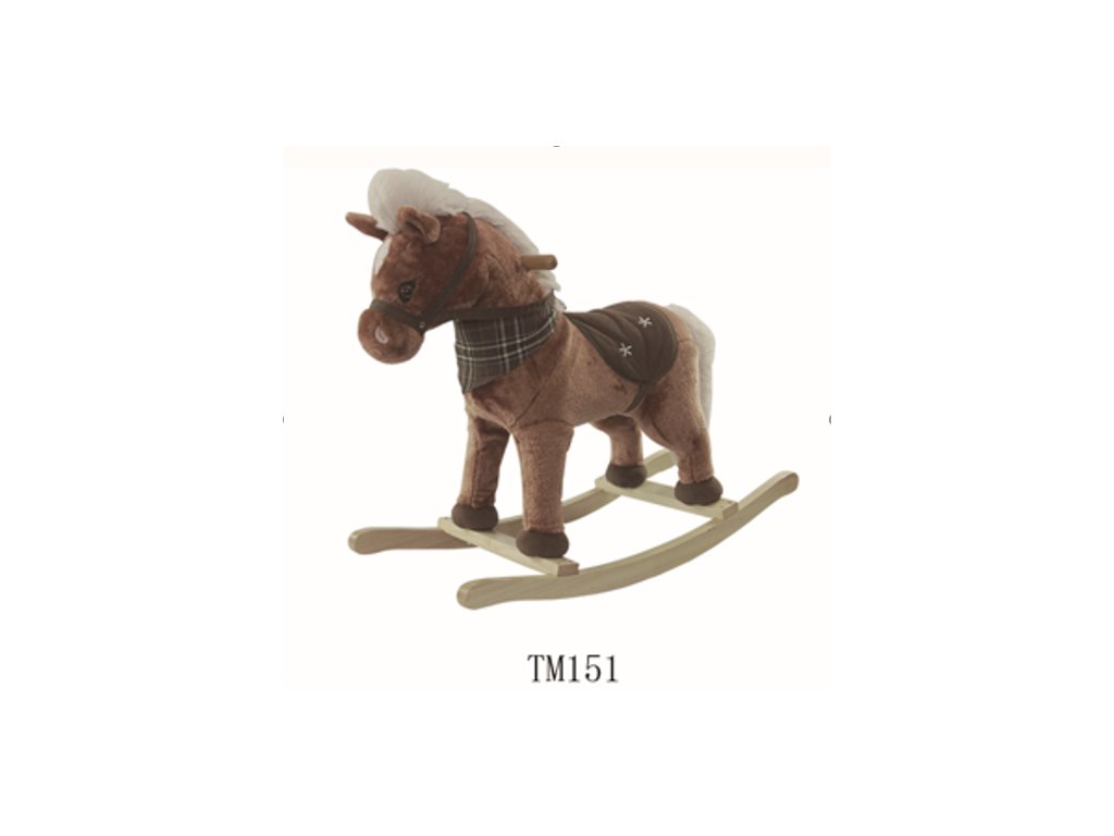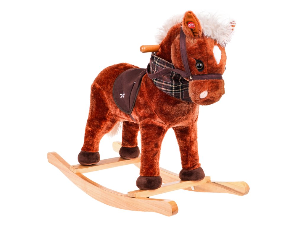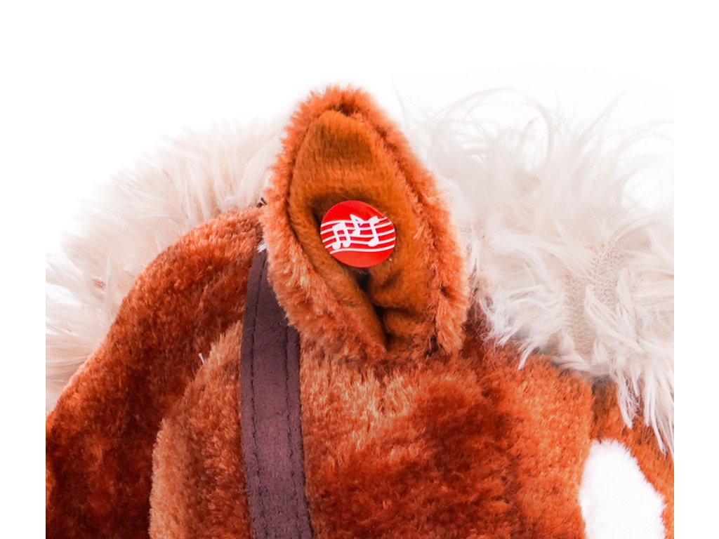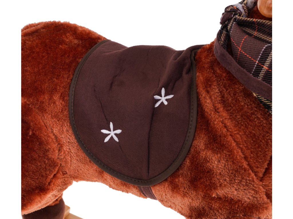 - sounds: neighing and gallop, - made of pleasant-to-touch material, - has safe wooden runners, - has a comfortable seat, - there is a scarf around the horse's neck. |