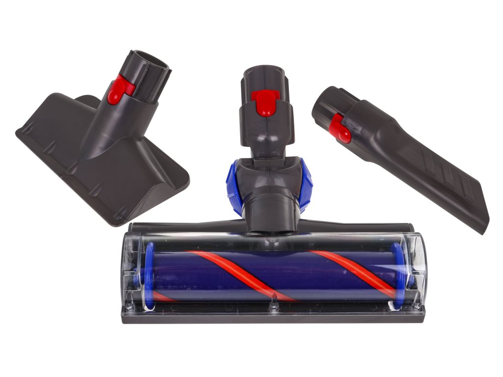 - a docking station for a vacuum cleaner approx. 80.5 cm x 19 cm x 17 cm, - vertical vacuum cleaner approx. 78.5 cm x 15.5 cm x 8 cm, - handheld vacuum cleaner with electro-brush, approx. 6 cm x 16 cm x 17 cm, - handheld vacuum cleaner with an upholstery brush, approx. 29 cm x 16 cm x 13 cm, - handheld vacuum cleaner with a crevice nozzle, approx. 35 cm x 16 cm x 8 cm, - polystyrene balls with a diameter of approx. 0.3 cm, - packaging approx. 61.5 cm x 38.5 cm x 10 cm. | |