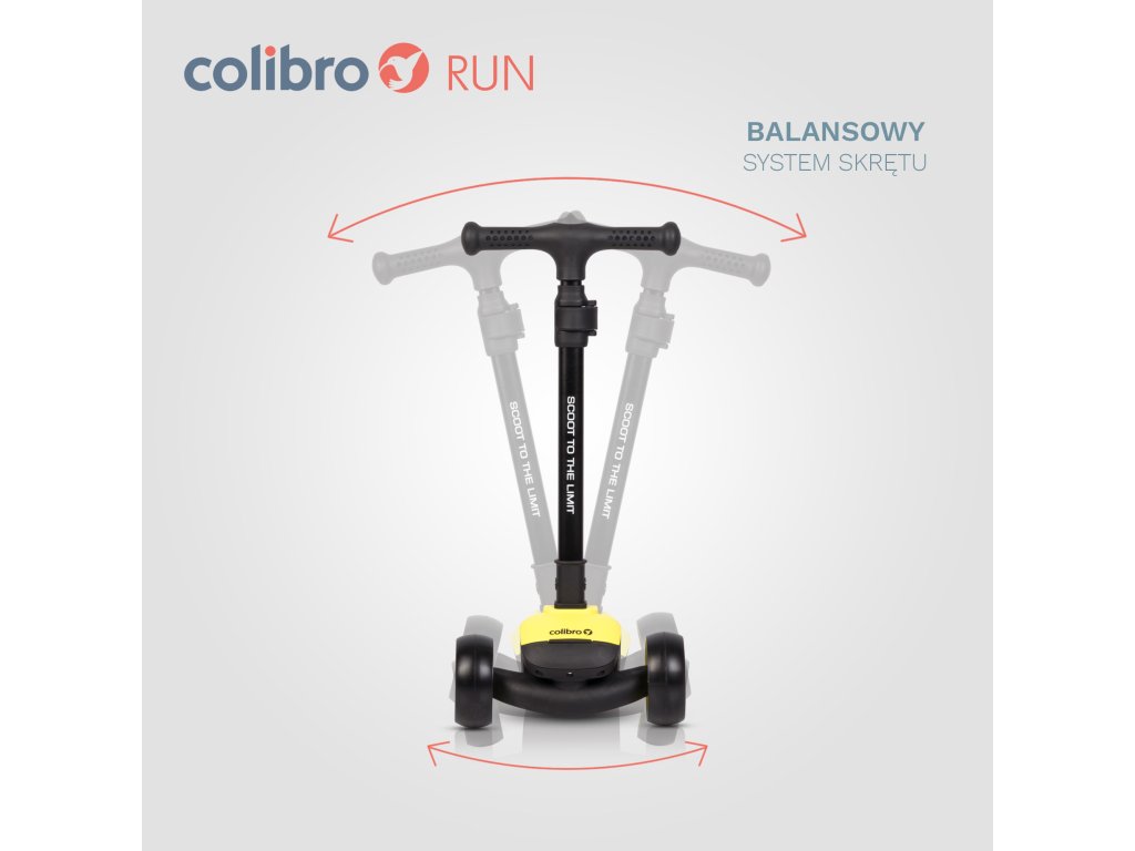 Hulajnoga dziecięca balansowa RUN marki COLIBRO – trójkołowa składana LED Hulajnoga balansowa RUN marki COLIBRO przeznaczona jest dla dzieci w wieku od 3 lat do wagi aż 50 kg. Dzięki zastosowaniu pełnego nylonowego pokładu, RUN jest niezwykle wytrzymałą hulajnogą. Pokład zachowuje sztywność nawet pod obciążeniem osoby dorosłej. Szerokie łożyskowane koła nie odchylają się od pionu pod obciążeniem dziecka, a ich opony wykonane zostały z elastomeru poliuretanowego, dzięki czemu są niezwykle odporne na ścieranie. Czym jest hulajnoga balansowa? Posiada ona skrętną przednią oś, a dziecko dokonuje skrętu poprzez balans ciałem. Taka konstrukcja zapewnia doskonałą zabawę oraz pomaga ćwiczyć zachowanie równowagi, które w przyszłości okaże się przydatne przy nauce innych sportów. Funkcja składania pozwala na łatwe przenoszenie i przechowywanie hulajnogi. Rozmiary po złożeniu umożliwiają spakowanie jej do plecaka lub walizki. Specjalna blokada zapobiega niezamierzonemu rozłożeniu podczas przenoszenia. Regulacja wysokości kierownicy pozwoli dopasować hulajnogę RUN do wzrostu dziecka. Gumowe antypoślizgowe rączki zapewniają wygodny i pewny chwyt podczas jazdy. Kierownica hulajnogi balansowej nie służy do skręcania lecz pomaga zachować równowagę podczas balansowania. Hamulec nożny jest skutecznym i niezawodnym rozwiązaniem. Nie wymaga okresowej regulacji, jak to jest w przypadku hamulców ręcznych. Światła LED w kołach działają na zasadzie dynama, więc hulajnoga nie wymaga stosowania baterii ani ładowania. Dodatkowo światła LED zwiększają frajdę z jazdy i zapewniają dobrą widoczność dziecka również po zmroku. Hulajnoga COLIBRO RUN pakowana jest w estetyczne kolorowe pudełko z plastikowym uchwytem do przenoszenia, dzięki czemu doskonale nadaje się na prezent. COLIBRO RUN – scoot to the limit! SPECYFIKACJA - hulajnoga dziecięca balansowa dla dzieci od 3 lat do wagi 50 kg, - pełny nylonowy pokład (zapewnia sztywność i wytrzymałość), - funkcja składania z automatyczną blokadą, - regulacja wysokości kierownicy, - niezawodny i bezobsługowy hamulec nożny, - antypoślizgowe uchwyty, - światła LED w kołach, - opony wykonane z elastomeru poliuretanowego (elastyczne i odporne na ścieranie) DANE TECHNICZNE Wymiary złożonej hulajnogi (dł. x szer. x wys.): 62 cm x 28,5 cm x 15 cm Wymiary rozłożonej hulajnogi (dł. x szer. x wys.): 61 cm x 28,5 cm x 64 - 77 cm (w zależności od ustawienia kierownicy) Maksymalna waga dziecka: 50 kg Waga: 2,95 kgKiegészítő paraméterek