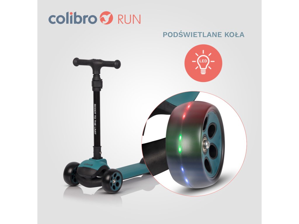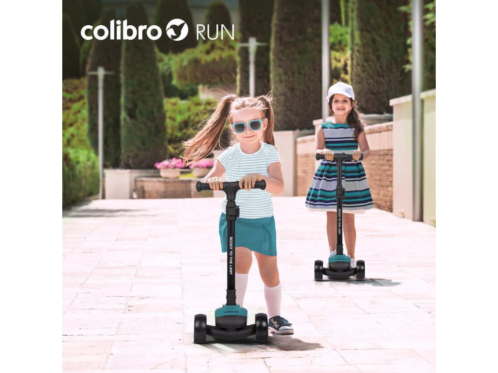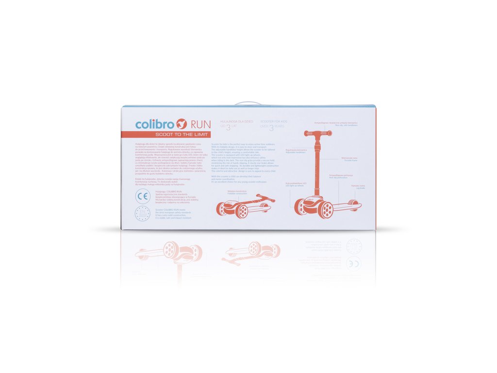 Hulajnoga dziecięca balansowa RUN marki COLIBRO – trójkołowa składana LED Hulajnoga balansowa RUN marki COLIBRO przeznaczona jest dla dzieci w wieku od 3 lat do wagi aż 50 kg. Dzięki zastosowaniu pełnego nylonowego pokładu, RUN jest niezwykle wytrzymałą hulajnogą. Pokład zachowuje sztywność nawet pod obciążeniem osoby dorosłej. Szerokie łożyskowane koła nie odchylają się od pionu pod obciążeniem dziecka, a ich opony wykonane zostały z elastomeru poliuretanowego, dzięki czemu są niezwykle odporne na ścieranie. Czym jest hulajnoga balansowa? Posiada ona skrętną przednią oś, a dziecko dokonuje skrętu poprzez balans ciałem. Taka konstrukcja zapewnia doskonałą zabawę oraz pomaga ćwiczyć zachowanie równowagi, które w przyszłości okaże się przydatne przy nauce innych sportów. Funkcja składania pozwala na łatwe przenoszenie i przechowywanie hulajnogi. Rozmiary po złożeniu umożliwiają spakowanie jej do plecaka lub walizki. Specjalna blokada zapobiega niezamierzonemu rozłożeniu podczas przenoszenia. Regulacja wysokości kierownicy pozwoli dopasować hulajnogę RUN do wzrostu dziecka. Gumowe antypoślizgowe rączki zapewniają wygodny i pewny chwyt podczas jazdy. Kierownica hulajnogi balansowej nie służy do skręcania lecz pomaga zachować równowagę podczas balansowania. Hamulec nożny jest skutecznym i niezawodnym rozwiązaniem. Nie wymaga okresowej regulacji, jak to jest w przypadku hamulców ręcznych. Światła LED w kołach działają na zasadzie dynama, więc hulajnoga nie wymaga stosowania baterii ani ładowania. Dodatkowo światła LED zwiększają frajdę z jazdy i zapewniają dobrą widoczność dziecka również po zmroku. Hulajnoga COLIBRO RUN pakowana jest w estetyczne kolorowe pudełko z plastikowym uchwytem do przenoszenia, dzięki czemu doskonale nadaje się na prezent. COLIBRO RUN – scoot to the limit! SPECYFIKACJA - hulajnoga dziecięca balansowa dla dzieci od 3 lat do wagi 50 kg, - pełny nylonowy pokład (zapewnia sztywność i wytrzymałość), - funkcja składania z automatyczną blokadą, - regulacja wysokości kierownicy, - niezawodny i bezobsługowy hamulec nożny, - antypoślizgowe uchwyty, - światła LED w kołach, - opony wykonane z elastomeru poliuretanowego (elastyczne i odporne na ścieranie) DANE TECHNICZNE Wymiary złożonej hulajnogi (dł. x szer. x wys.): 62 cm x 28,5 cm x 15 cm Wymiary rozłożonej hulajnogi (dł. x szer. x wys.): 61 cm x 28,5 cm x 64 - 77 cm (w zależności od ustawienia kierownicy) Maksymalna waga dziecka: 50 kg Waga: 2,95 kgKiegészítő paraméterek
