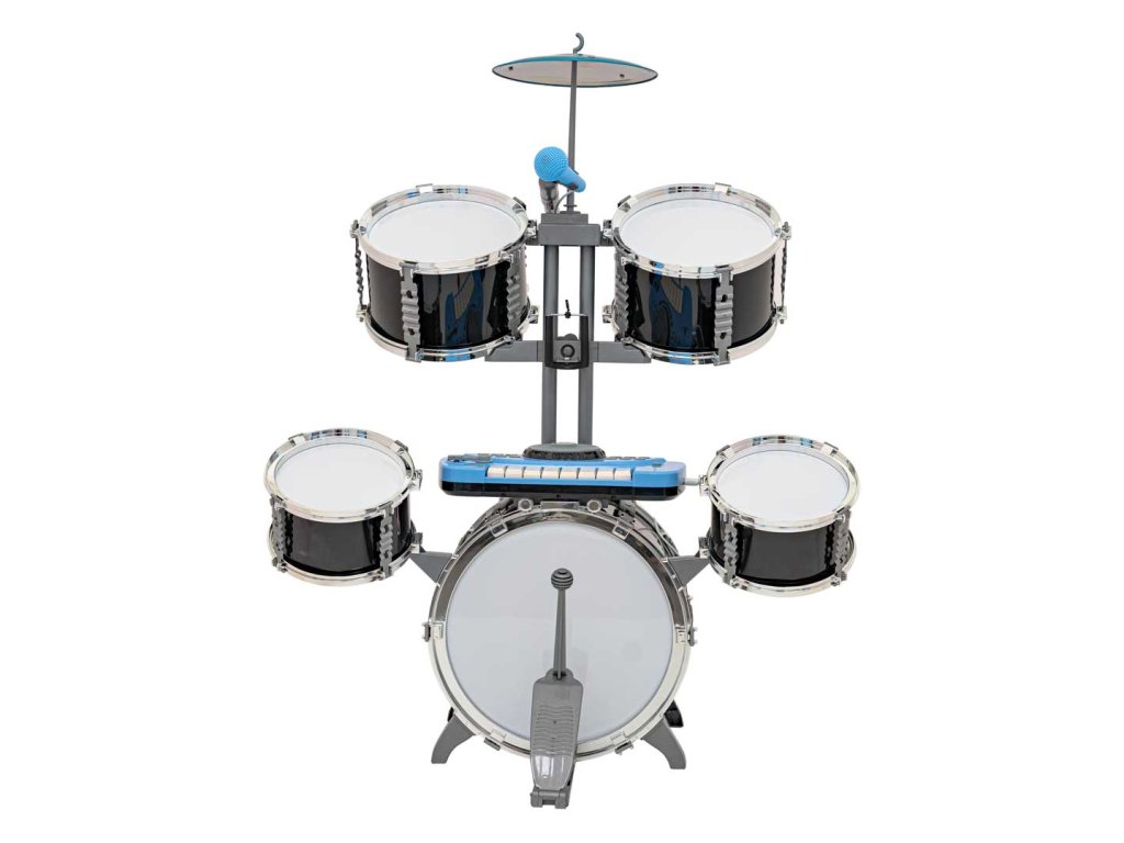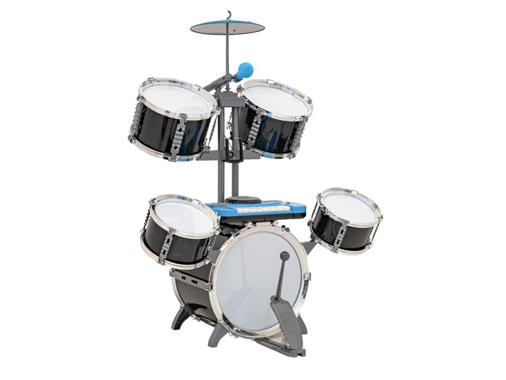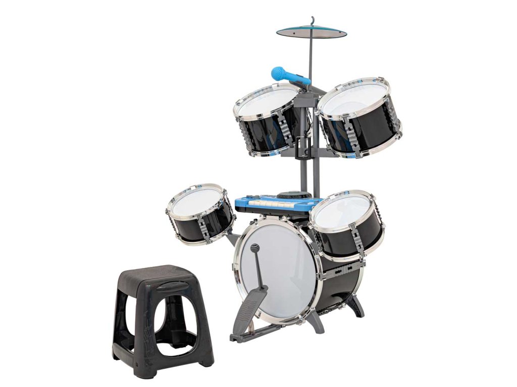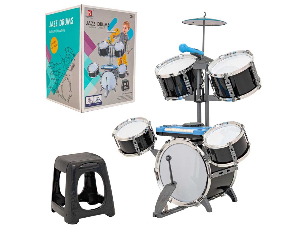 A large black drum set with a keyboard and microphone for children from 3 years of age. The drums are made of safe, high-quality materials. It looks like a professional instrument. It is equipped with five drums, a cymbal, a set of sticks, a microphone and a keyboard. The set also includes a stool. The keyboard has many interesting functions such as a mixer, pre-loaded melodies, a demo version, the ability to record and play back, and a microphone and MP3 input. The keyboard is powered by 4 x AA 1.5V batteries (included). Playing with this set develops musical skills, sense of hearing and teaches to distinguish sounds.