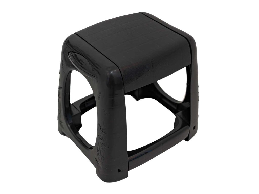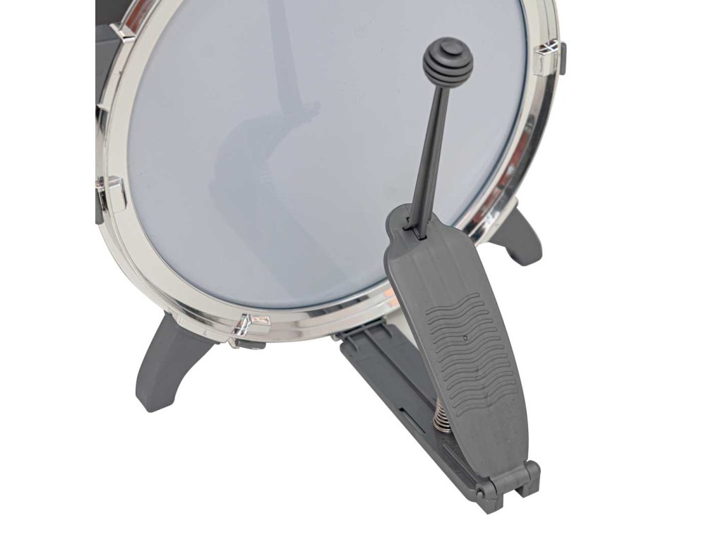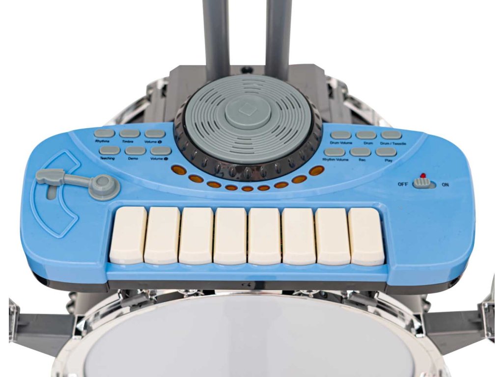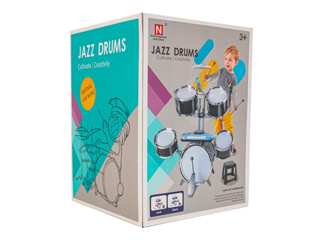 A large black drum set with a keyboard and microphone for children from 3 years of age. The drums are made of safe, high-quality materials. It looks like a professional instrument. It is equipped with five drums, a cymbal, a set of sticks, a microphone and a keyboard. The set also includes a stool. The keyboard has many interesting functions such as a mixer, pre-loaded melodies, a demo version, the ability to record and play back, and a microphone and MP3 input. The keyboard is powered by 4 x AA 1.5V batteries (included). Playing with this set develops musical skills, sense of hearing and teaches to distinguish sounds.