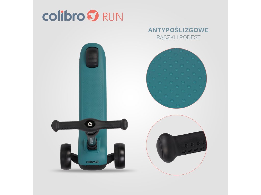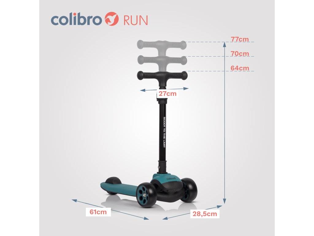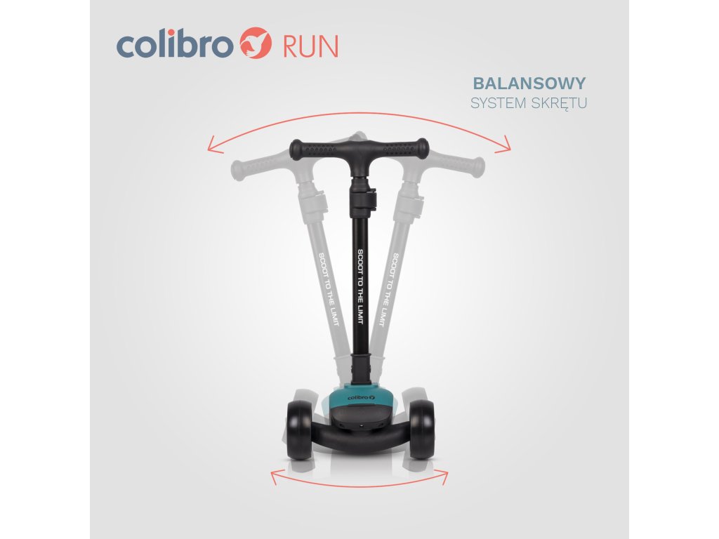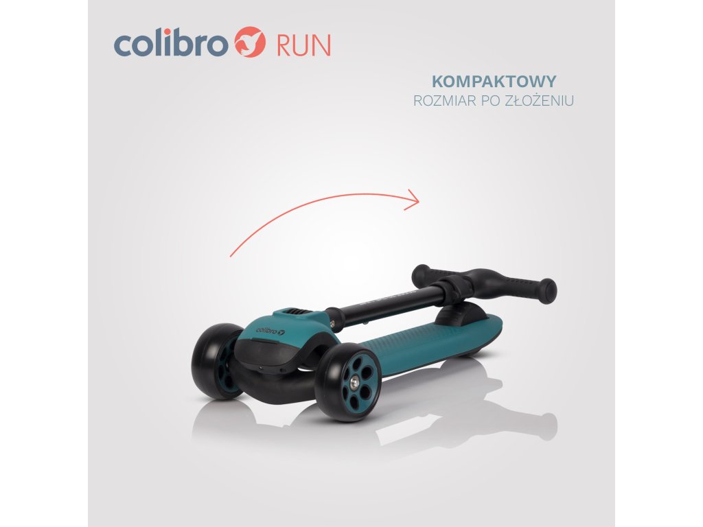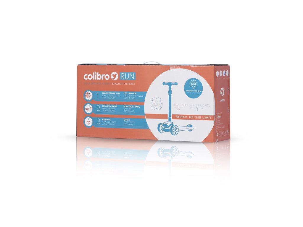 Hulajnoga dziecięca balansowa RUN marki COLIBRO – trójkołowa składana LED Hulajnoga balansowa RUN marki COLIBRO przeznaczona jest dla dzieci w wieku od 3 lat do wagi aż 50 kg. Dzięki zastosowaniu pełnego nylonowego pokładu, RUN jest niezwykle wytrzymałą hulajnogą. Pokład zachowuje sztywność nawet pod obciążeniem osoby dorosłej. Szerokie łożyskowane koła nie odchylają się od pionu pod obciążeniem dziecka, a ich opony wykonane zostały z elastomeru poliuretanowego, dzięki czemu są niezwykle odporne na ścieranie. Czym jest hulajnoga balansowa? Posiada ona skrętną przednią oś, a dziecko dokonuje skrętu poprzez balans ciałem. Taka konstrukcja zapewnia doskonałą zabawę oraz pomaga ćwiczyć zachowanie równowagi, które w przyszłości okaże się przydatne przy nauce innych sportów. Funkcja składania pozwala na łatwe przenoszenie i przechowywanie hulajnogi. Rozmiary po złożeniu umożliwiają spakowanie jej do plecaka lub walizki. Specjalna blokada zapobiega niezamierzonemu rozłożeniu podczas przenoszenia. Regulacja wysokości kierownicy pozwoli dopasować hulajnogę RUN do wzrostu dziecka. Gumowe antypoślizgowe rączki zapewniają wygodny i pewny chwyt podczas jazdy. Kierownica hulajnogi balansowej nie służy do skręcania lecz pomaga zachować równowagę podczas balansowania. Hamulec nożny jest skutecznym i niezawodnym rozwiązaniem. Nie wymaga okresowej regulacji, jak to jest w przypadku hamulców ręcznych. Światła LED w kołach działają na zasadzie dynama, więc hulajnoga nie wymaga stosowania baterii ani ładowania. Dodatkowo światła LED zwiększają frajdę z jazdy i zapewniają dobrą widoczność dziecka również po zmroku. Hulajnoga COLIBRO RUN pakowana jest w estetyczne kolorowe pudełko z plastikowym uchwytem do przenoszenia, dzięki czemu doskonale nadaje się na prezent. COLIBRO RUN – scoot to the limit! SPECYFIKACJA - hulajnoga dziecięca balansowa dla dzieci od 3 lat do wagi 50 kg, - pełny nylonowy pokład (zapewnia sztywność i wytrzymałość), - funkcja składania z automatyczną blokadą, - regulacja wysokości kierownicy, - niezawodny i bezobsługowy hamulec nożny, - antypoślizgowe uchwyty, - światła LED w kołach, - opony wykonane z elastomeru poliuretanowego (elastyczne i odporne na ścieranie) DANE TECHNICZNE Wymiary złożonej hulajnogi (dł. x szer. x wys.): 62 cm x 28,5 cm x 15 cm Wymiary rozłożonej hulajnogi (dł. x szer. x wys.): 61 cm x 28,5 cm x 64 - 77 cm (w zależności od ustawienia kierownicy) Maksymalna waga dziecka: 50 kg Waga: 2,95 kgDoplňkové parametry