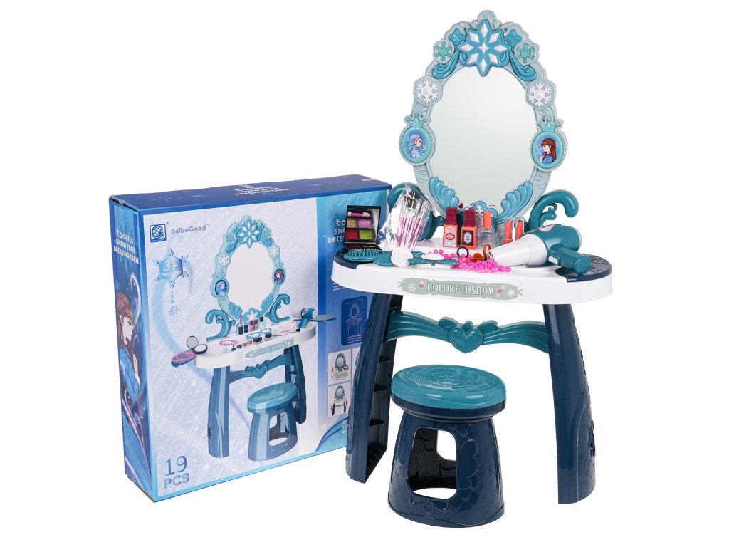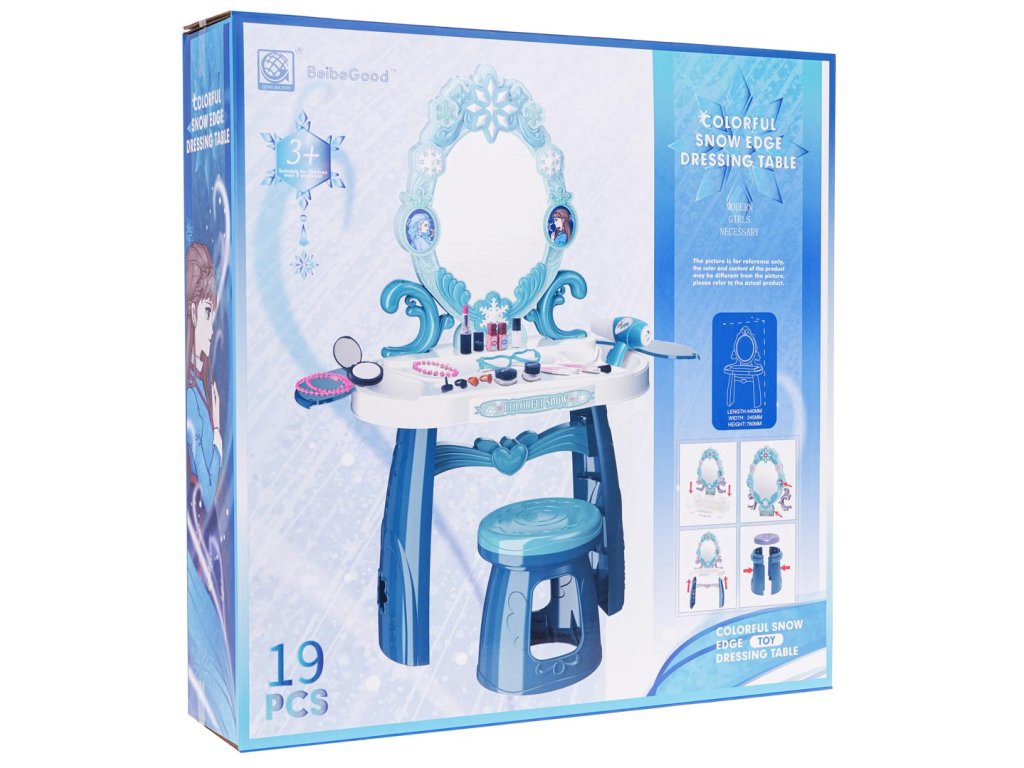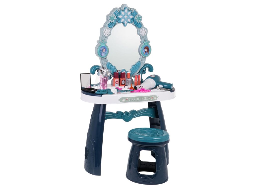 - intended for children from 3 years of age, - made of the best quality plastic in vivid colors, - a beautifully decorated mirror, - sound effects, - lighting effects, - spacious countertop for cosmetics, - stable construction, - comfortable chair, - dryer with air flow and drying sounds, - a wide range of painting accessories.