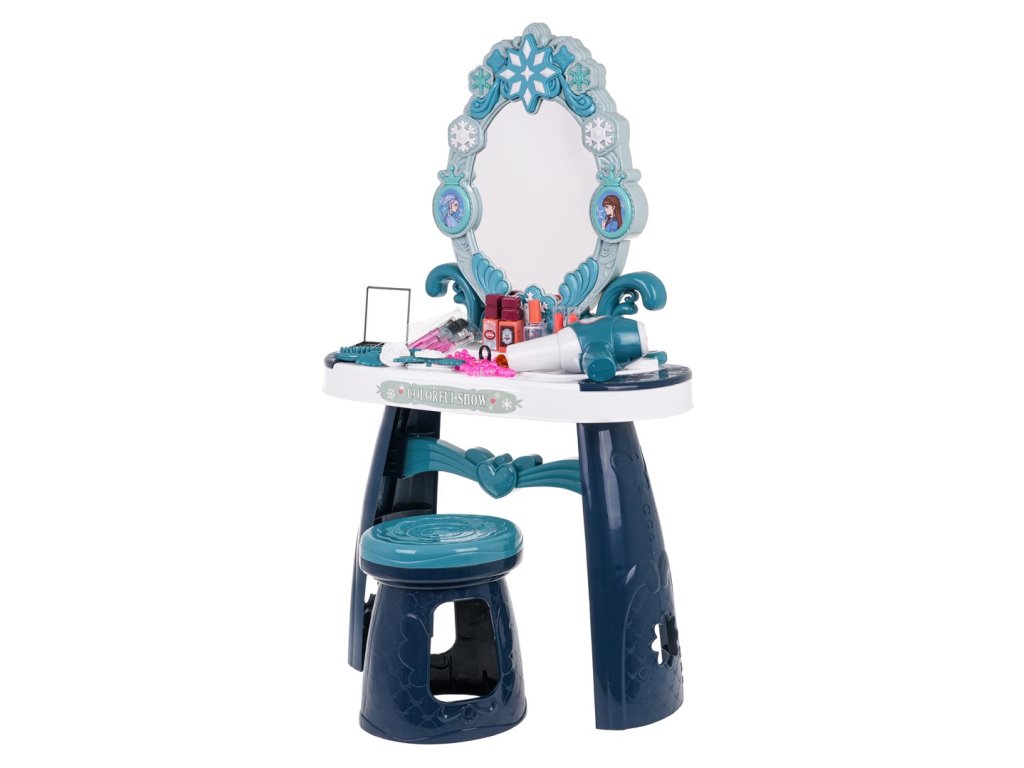 Interactive dressing table with accessories and a stool, for children from 3 years of age. The set is made of the best quality plastic in vivid colors. In addition to a beautiful dressing table with a top and a decorated mirror, we also have a comfortable stool for little beauties. The set includes a hair dryer, as well as a rich set of accessories for painting. The dressing table is powered by 3 x AA 1.5 V batteries (not included), the dryer by 1 x AA 1.5 V batteries (not included).