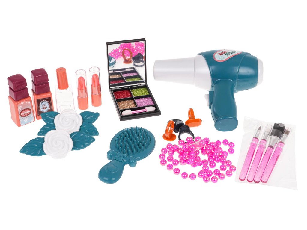 - vanity table, - stool, - dryer, - corals, - bracelet, - 2 x lipstick mockups, - fake nail polish, - fake perfume, - cosmetic container, - 2 x hair clip, - hairbrush, - 4 x ring, - cosmetic bag with mirror, brush and mock eyeshadow, - 4 x painting brush. |