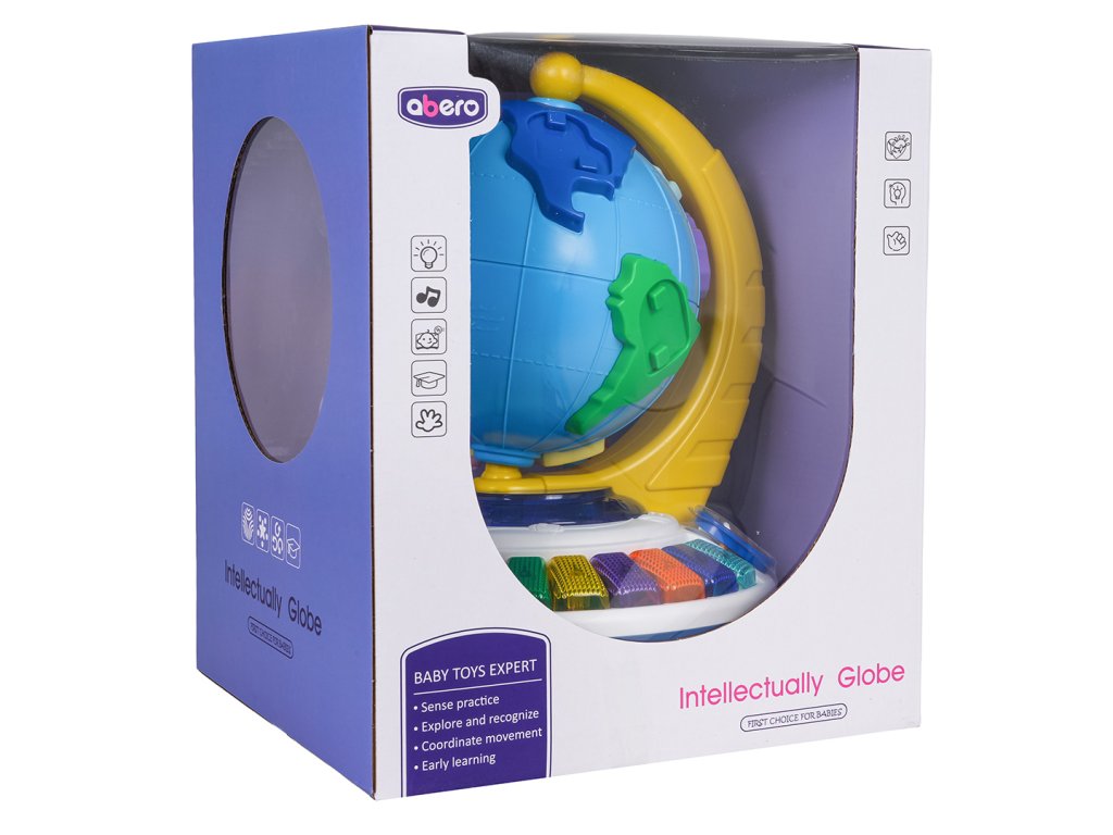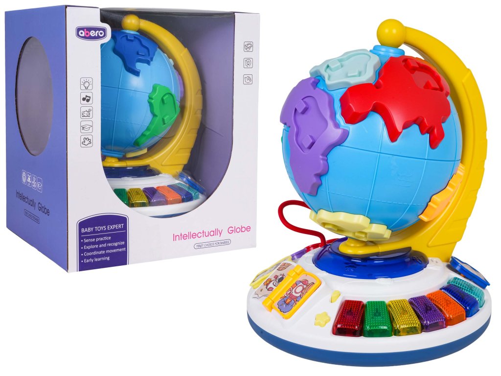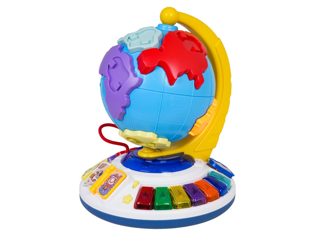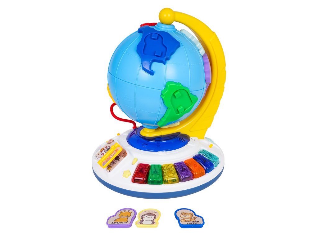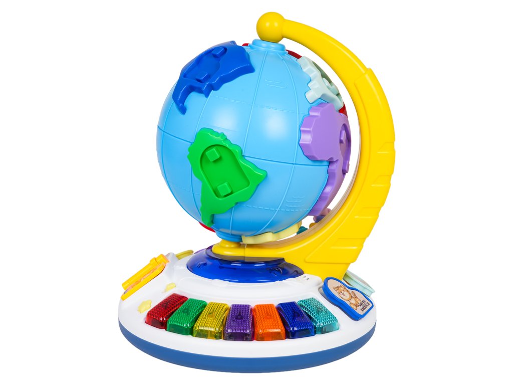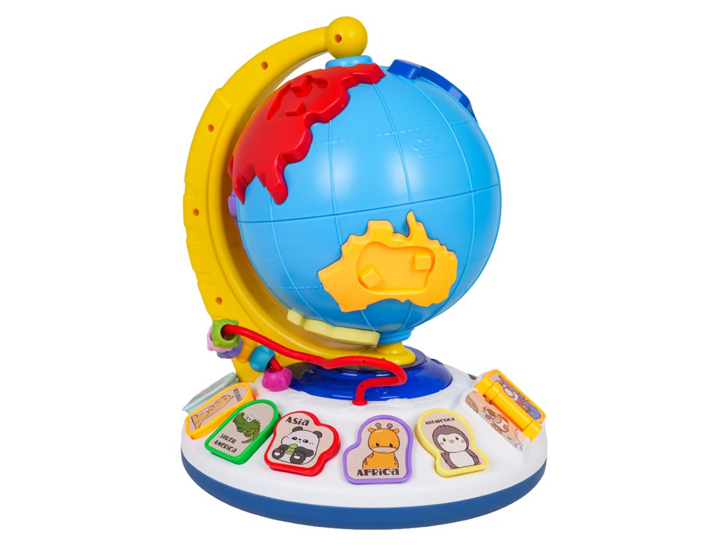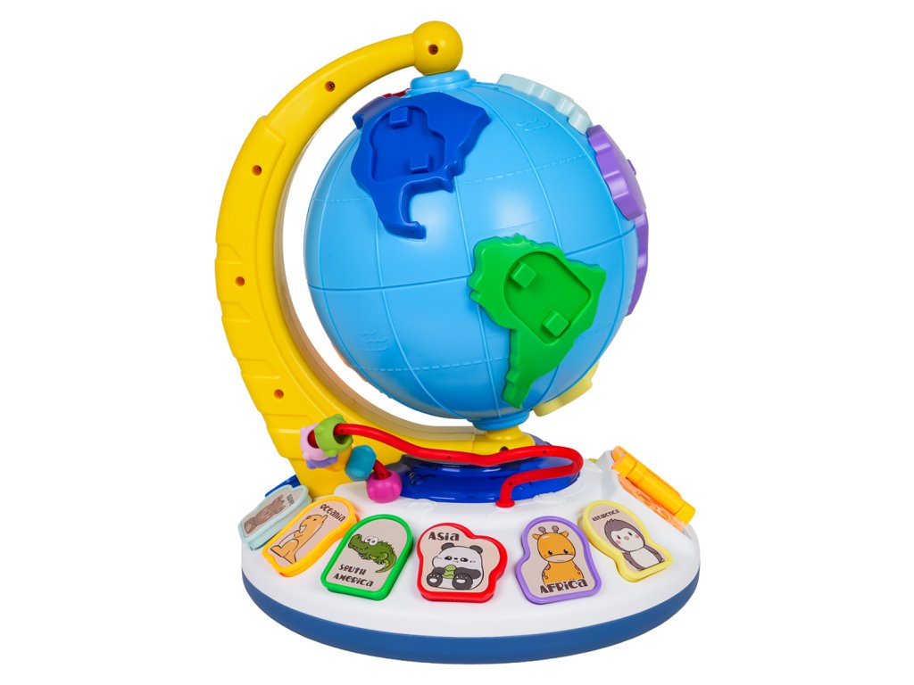 An interactive globe with sound and light functions for children from eighteen months of age. This educational toy is made of the highest quality materials in vibrant colors. The globe section features raised elements imitating continents. Each continent has a recess for a pin featuring an animal that lives on that continent. The set includes seven continents and seven animal pins. The globe can be rotated 360 degrees around its fixed base. Beneath the globe is a sturdy base with recesses for pins featuring animals (the same as the continents), a backlit piano with colorful keys, a book with flip-pages, and a beaded flip-page puzzle. The globe is the perfect tool to encourage toddlers to learn and develop a love of geography. It will help children learn about the continents and their locations on the globe, as well as animals, shapes, and colors through play. It also develops fine motor skills, a sense of touch, dexterity, hand-eye coordination, and imagination. The toy is powered by 3 x AA 1.5V batteries (not included).