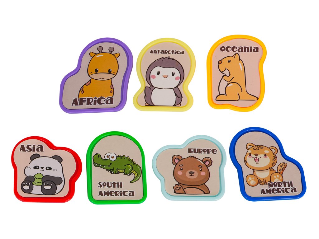- interactive globe, - 7 pins with pictures of animals, - blister with 32 stickers of sea and land animals. |