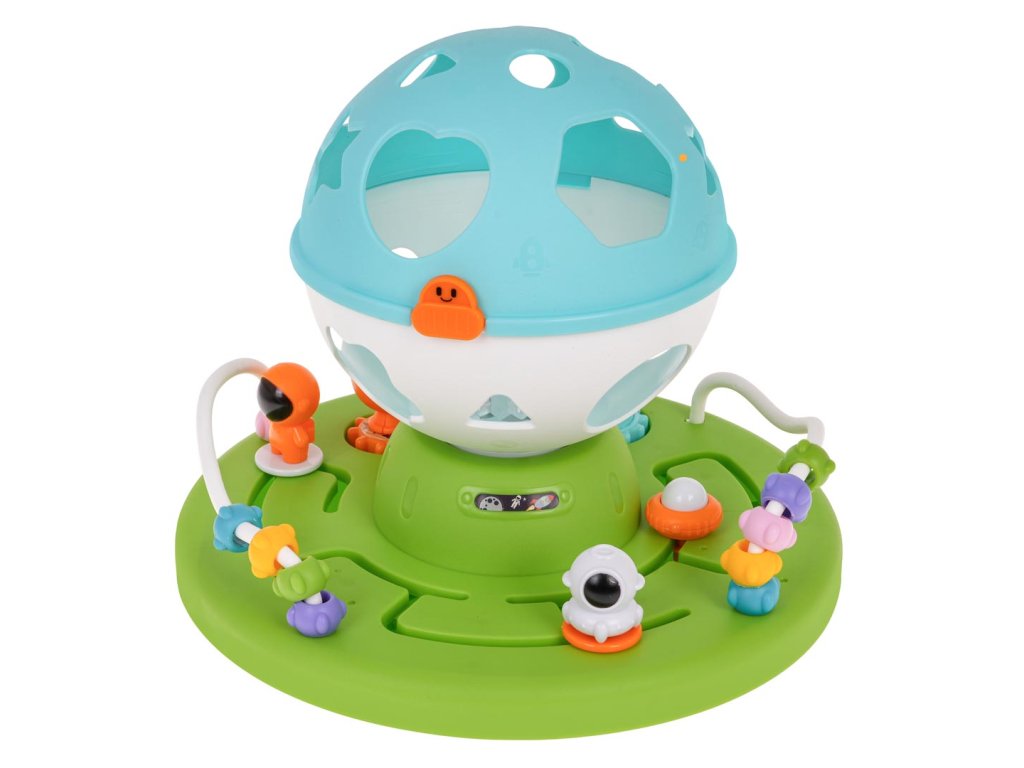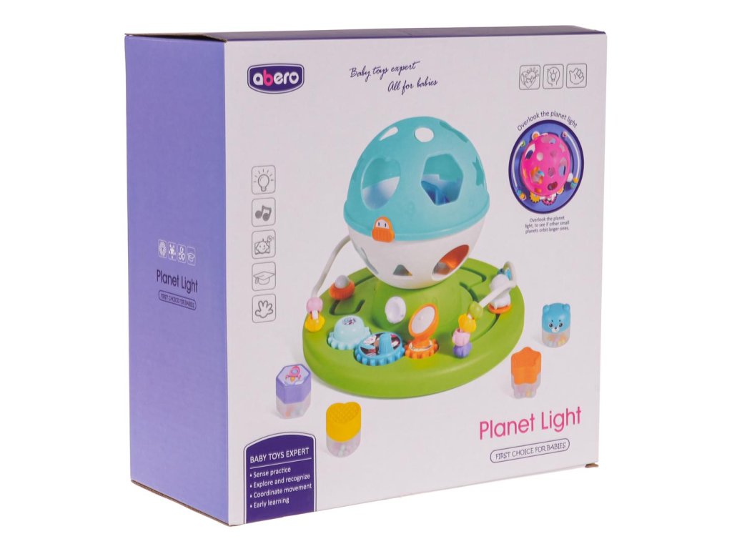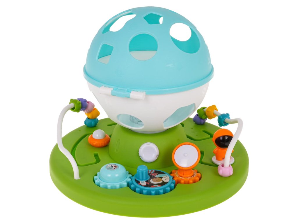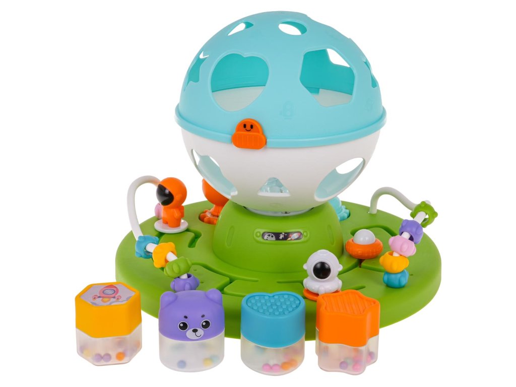 Interactive, educational, space-themed sorter for babies from 18 months of age. The sorter is made of the best quality plastic in vivid colors that attract the baby's eye. The toy consists of a base with gears to turn, mazes to overcome and layers. There is also a round sorter with holes in the shape of geometric figures on the base. The baby must match the blocks in the set to the appropriate shapes on the sorter. After matching all the blocks, the sorter can be opened and the fun can start again. The set includes 4 blocks. Additionally, each of them has small balls inside, which make the block rattle. The sorter also has a light and sound function, a starry glow comes out from inside the ball and melodies can be heard. Playing with this sorter teaches the baby to match and categorize by shape and color. It improves cognitive and motor skills. The child learns cause and effect and improves problem-solving skills. The toy is powered by 3 x AA 1.5 V batteries (not included).