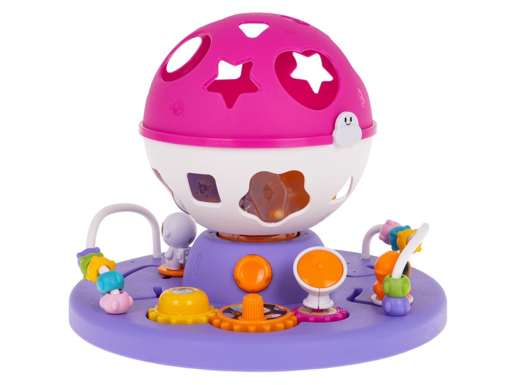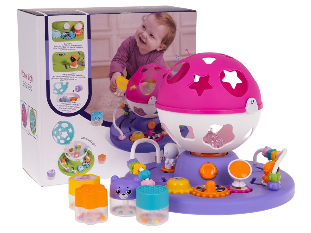 - suitable for babies from 18 months of age, - made of the best quality plastic in vivid colors, - offers a lot of fun possibilities: shape and color sorter, gears for spinning, mazes, layering puzzles, - sound functions: melodies, rattling blocks, - light functions: projector, - blocks with balls inside, |