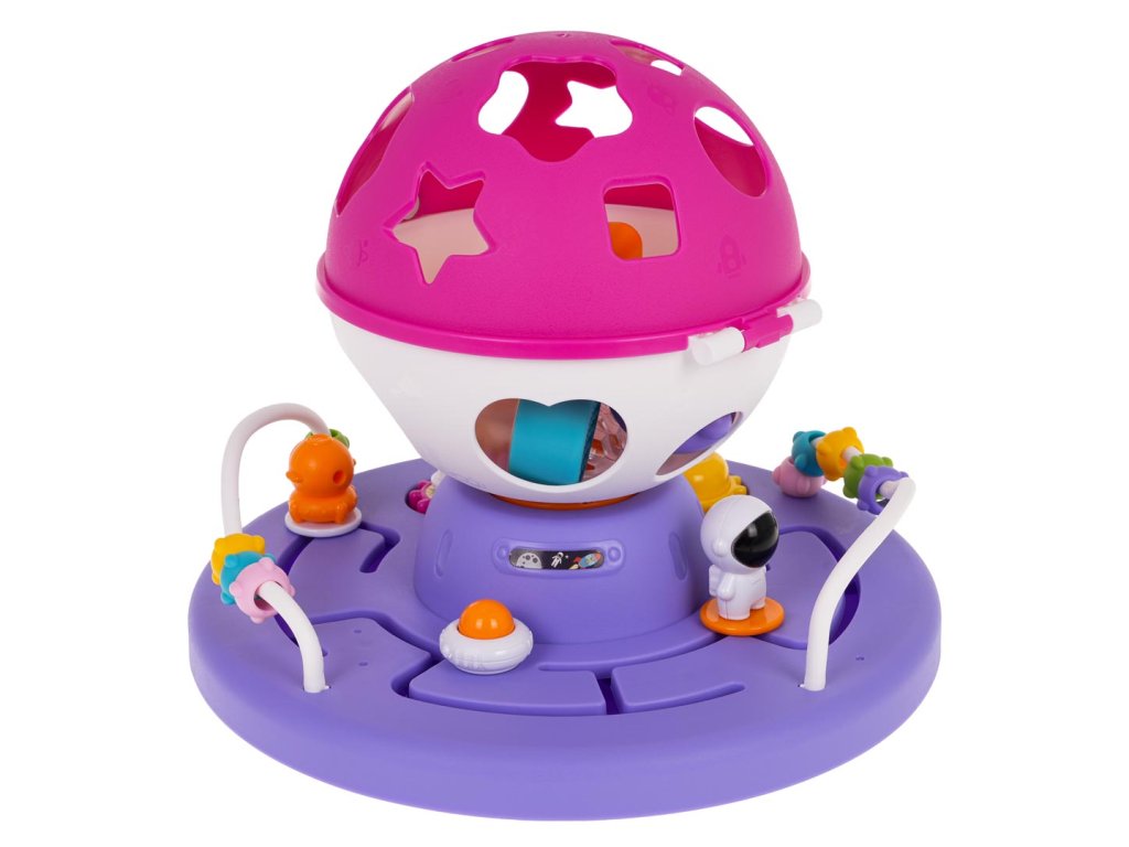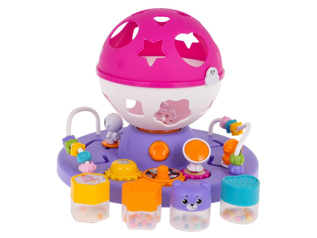 Interactive, educational, space-themed sorter for babies from 18 months of age. The sorter is made of the best quality plastic in vivid colors that attract the baby's eye. The toy consists of a base with gears to turn, mazes to overcome and layers. There is also a round sorter with holes in the shape of geometric figures on the base. The baby must match the blocks in the set to the appropriate shapes on the sorter. After matching all the blocks, the sorter can be opened and the fun can start again. The set includes 4 blocks. Additionally, each of them has small balls inside, which make the block rattle. The sorter also has a light and sound function, a starry glow comes out from inside the ball and melodies can be heard. Playing with this sorter teaches the baby to match and categorize by shape and color. It improves cognitive and motor skills. The child learns cause and effect and improves problem-solving skills. The toy is powered by 3 x AA 1.5 V batteries (not included).