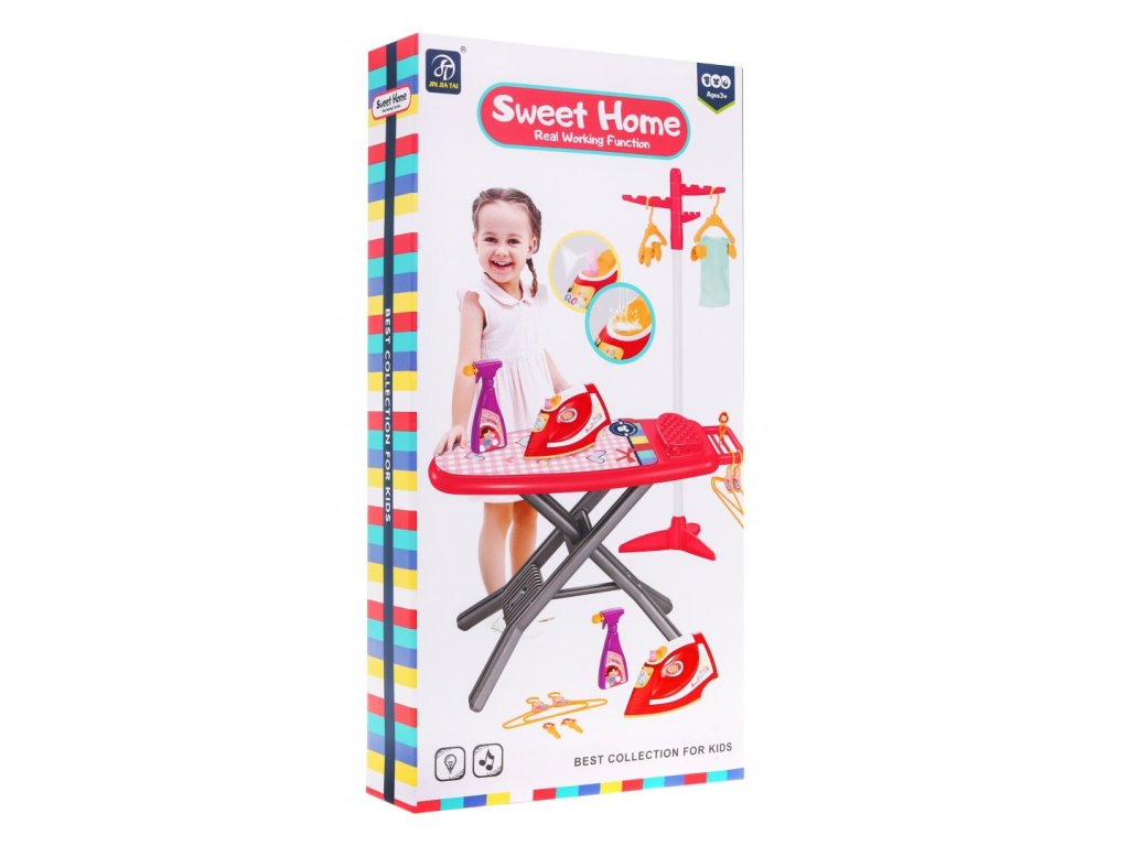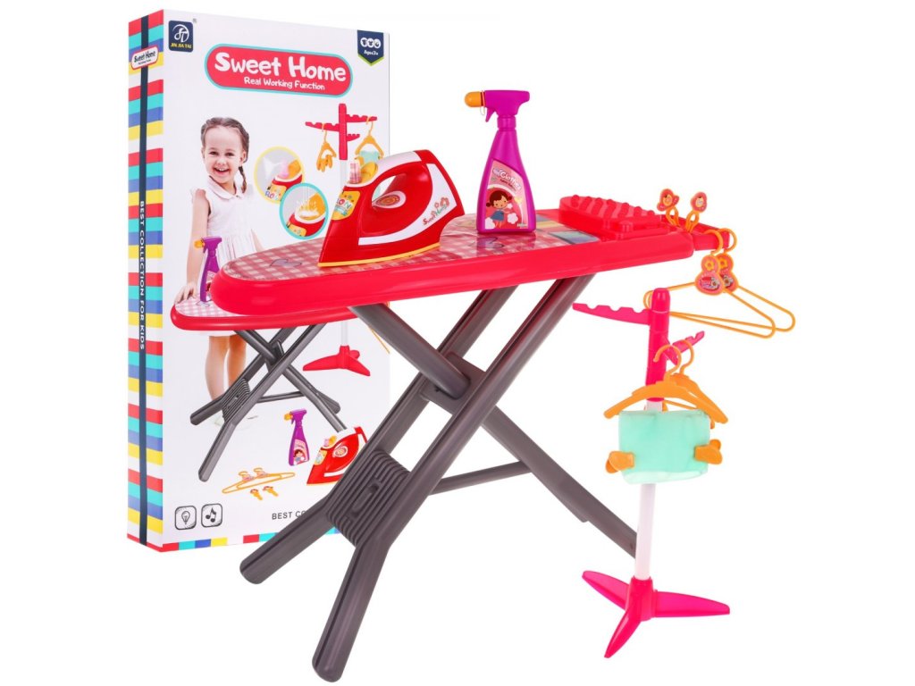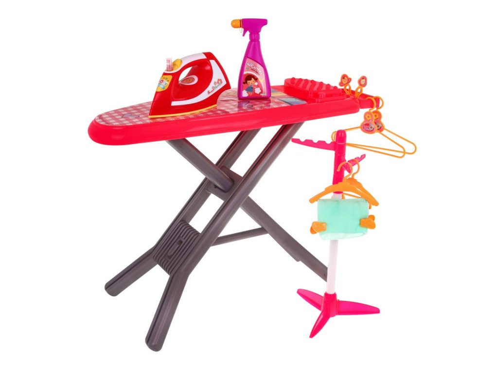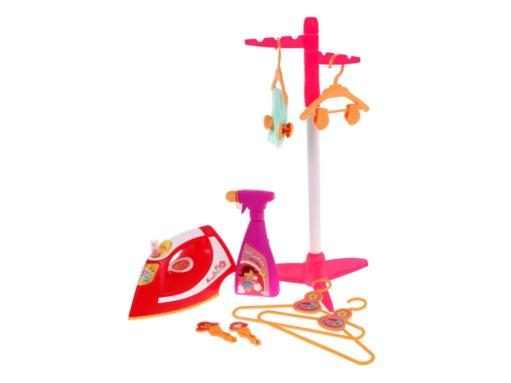 - ironing board, - iron with washer, - stand, - 4 hangers (2 large and 2 smaller), - 4 paper clips for washing laundry, - 4 smaller clips / clips for hanging laundry, - washer (imitation), - fabric, - colorful packaging, ideal for a gift. | |