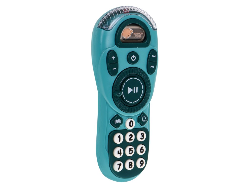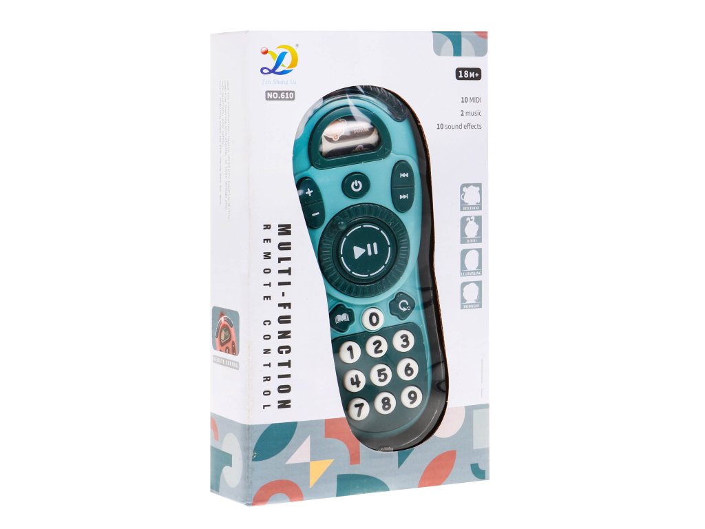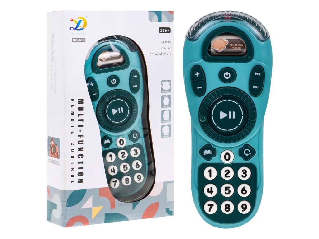 An interactive, multifunctional remote control with sound and light effects is a proposal for children from 18 months of age. The toy is powered by 3 X AA 1.5V batteries (not included). Remote functions: - volume +/- - on off, - the LED at the top of the remote control lights up when each button is pressed, - sounds - songs, sounds of animals, children, when each button is pressed, - in the central part, a turning handle that activates the translator on top of the remote control. | |