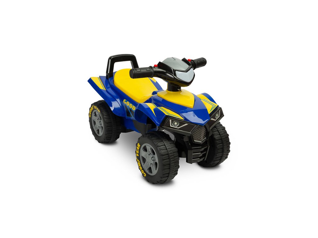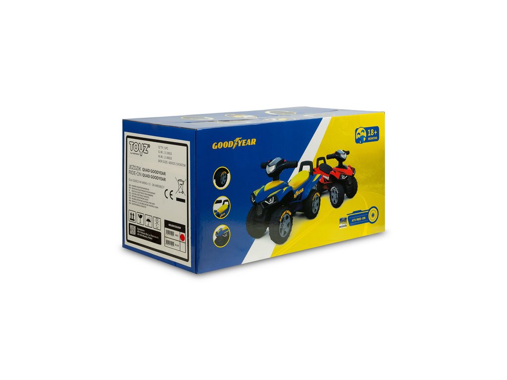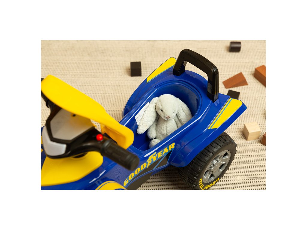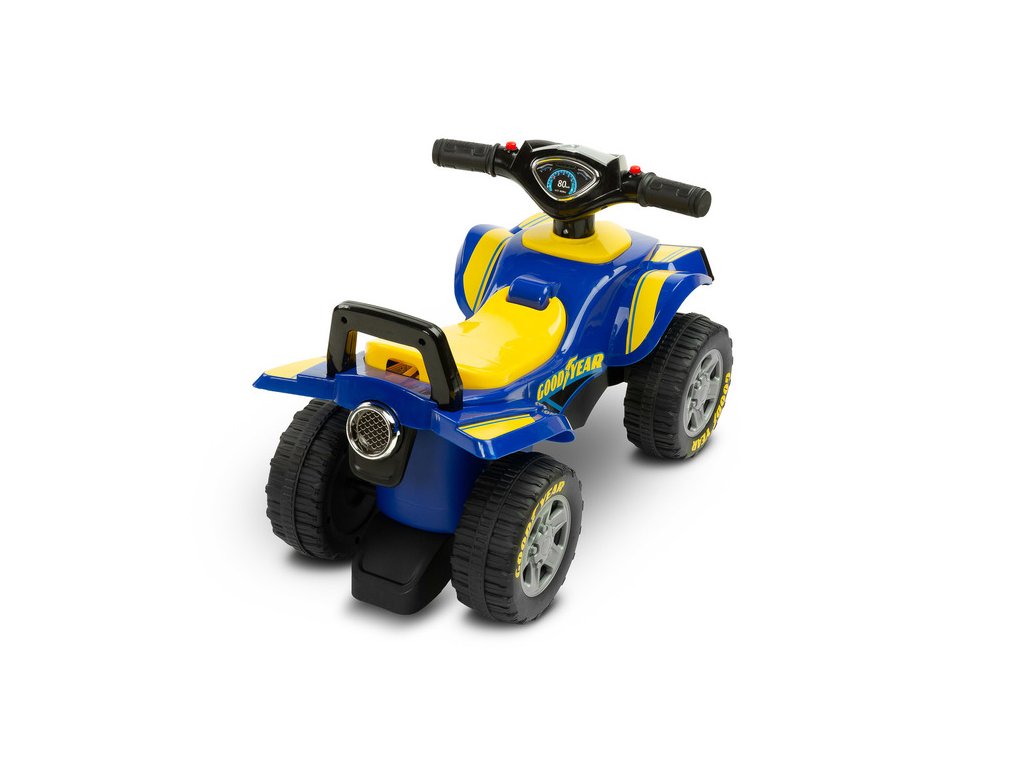 Čtyřkolka Goodyear od TOYZ je hračka určená pro děti ve věku od 1 do 3 let. Hračka ve tvaru čtyřkolového vozidla je vybavena volantem s tlačítky odpovědnými za zvuk houkačky a spuštění motoru. Výrobek je vyroben z vysoce kvalitních materiálů, což zaručuje jeho trvanlivost a spolehlivost. Hračka se snadno čistí a skladuje. Jízda má bezpečnostní zařízení, která zabraňují převrácení dozadu