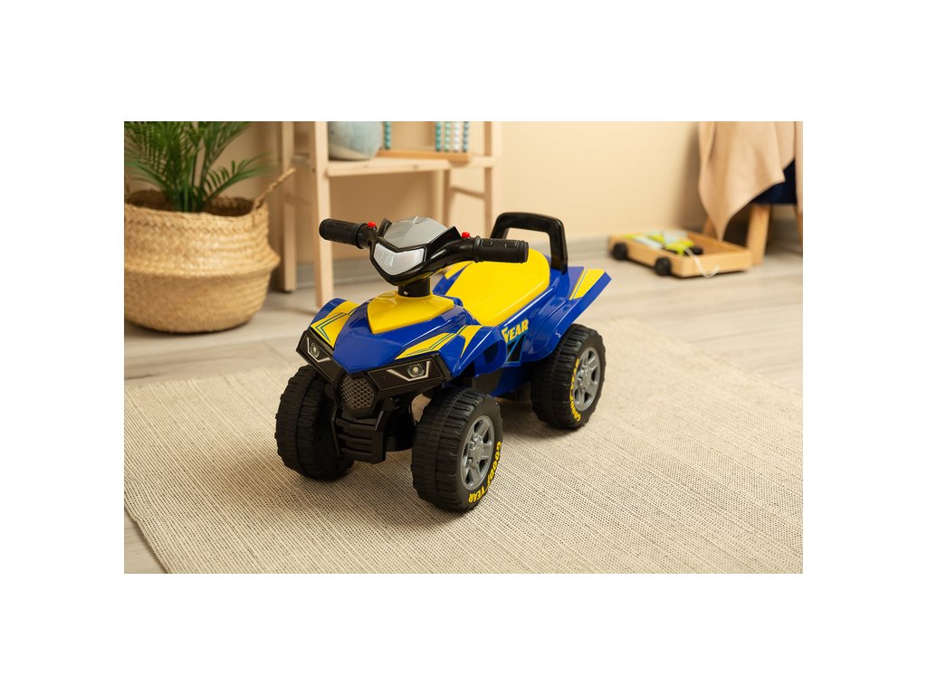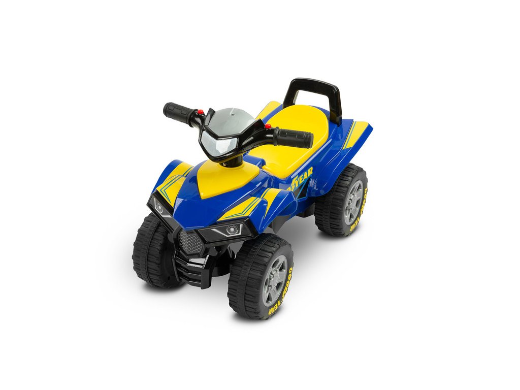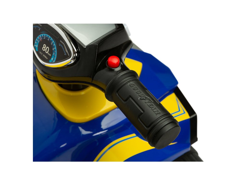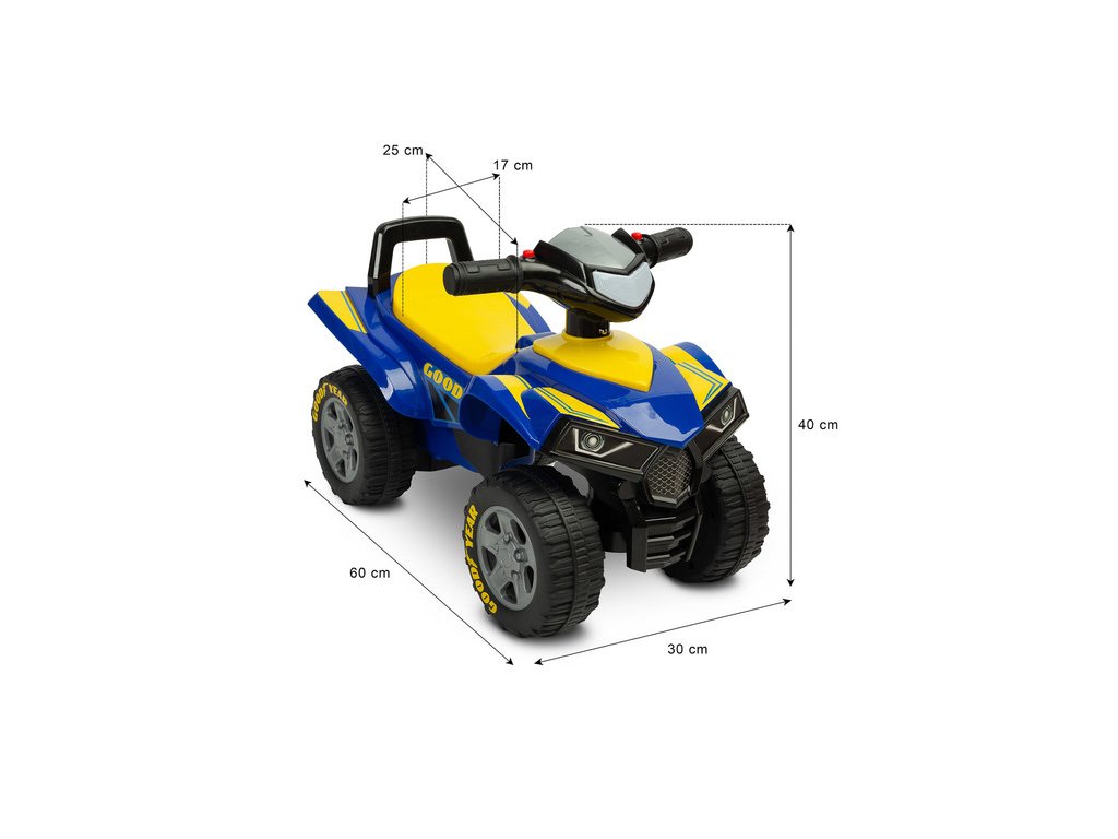 Čtyřkolka Goodyear od TOYZ je hračka určená pro děti ve věku od 1 do 3 let. Hračka ve tvaru čtyřkolového vozidla je vybavena volantem s tlačítky odpovědnými za zvuk houkačky a spuštění motoru. Výrobek je vyroben z vysoce kvalitních materiálů, což zaručuje jeho trvanlivost a spolehlivost. Hračka se snadno čistí a skladuje. Jízda má bezpečnostní zařízení, která zabraňují převrácení dozadu