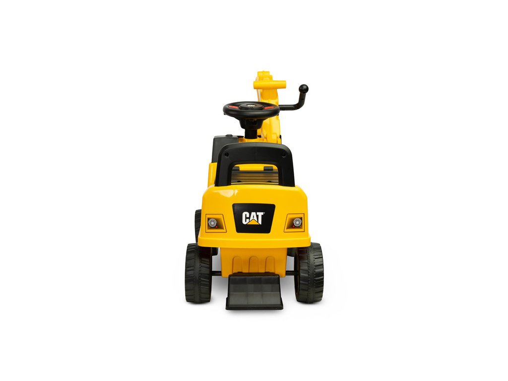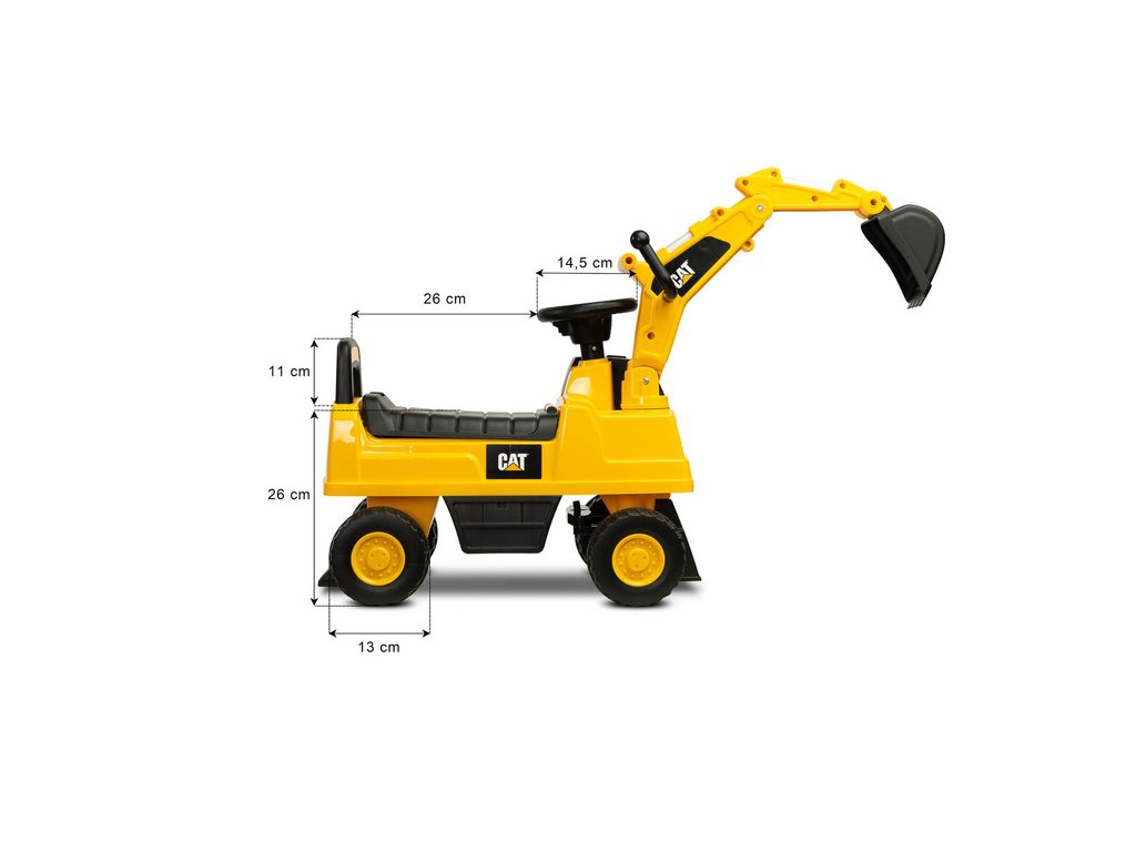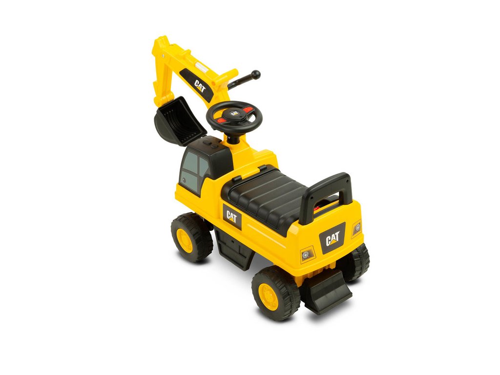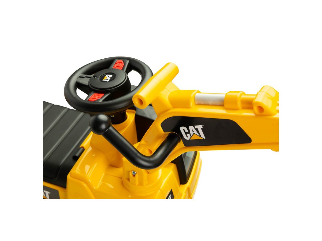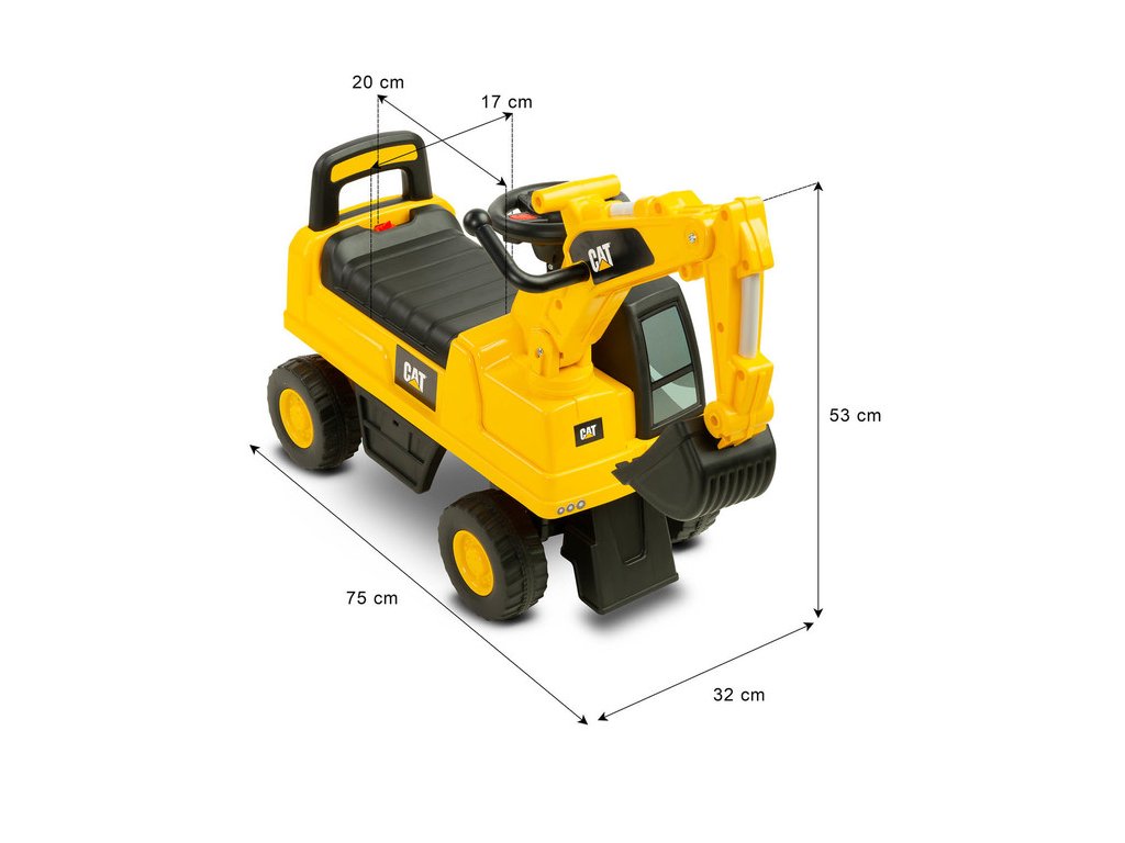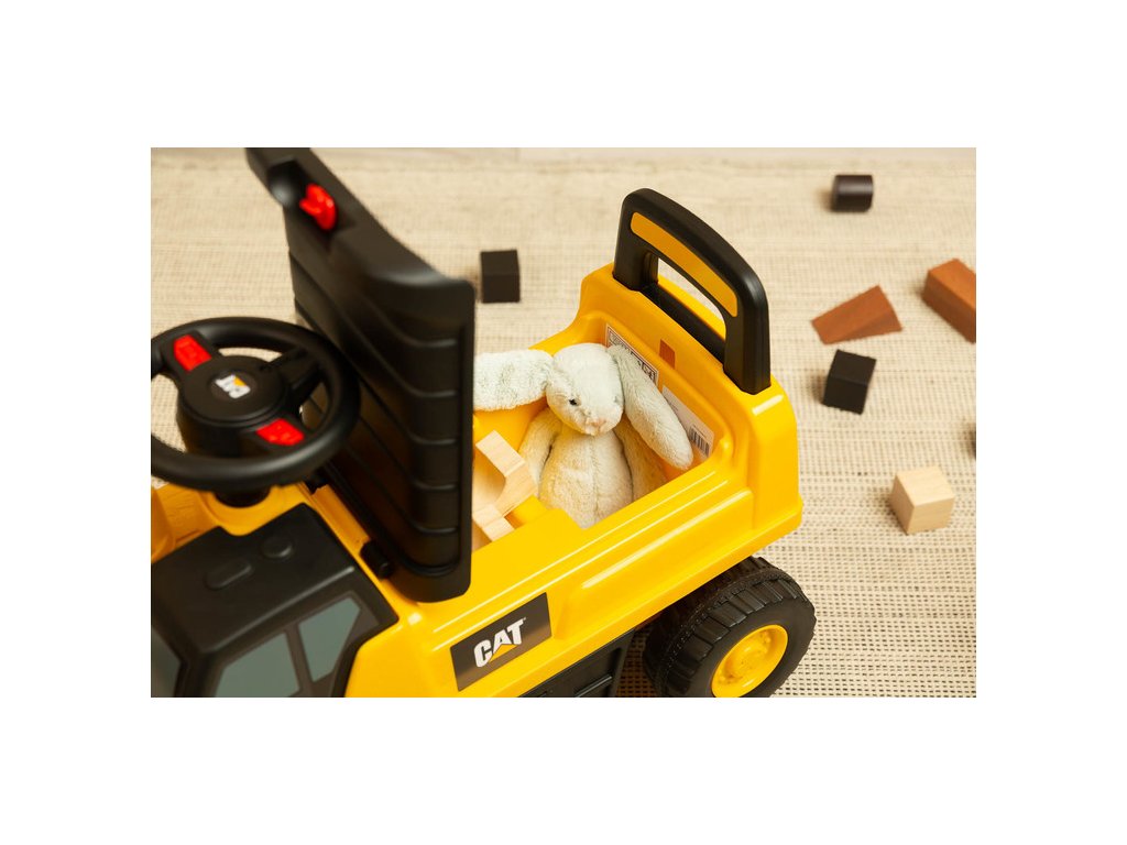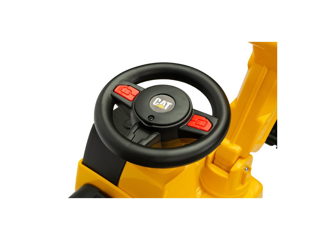 Jedinečný vzhled díky licenci značky CAT Volant s klaksonem Pohyblivá lžíce bagru Prostorný úložný prostor pod sedadlem Otočná přední kola Ochrana proti převrácení Technické údaje: