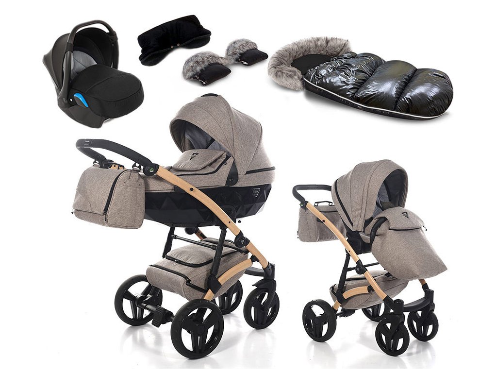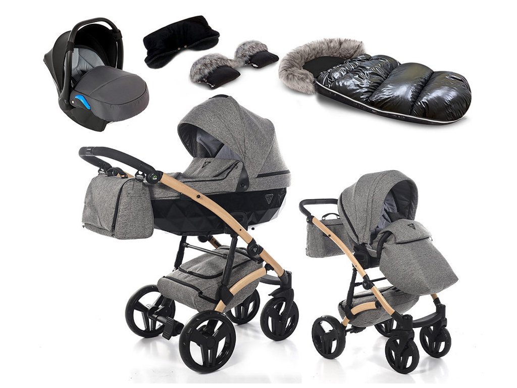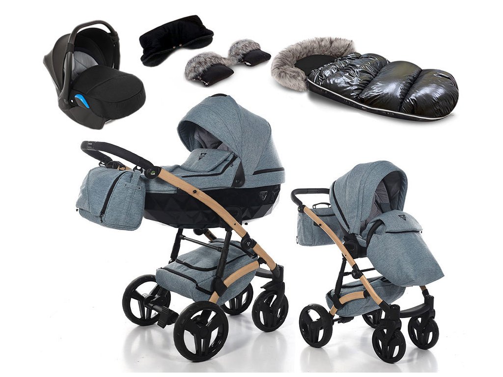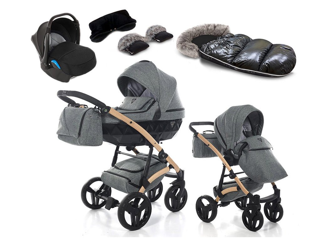 Sada obsahuje:     podvozek + hlubokou korbu + sportovní sedačku s nánožníkem + přebalovací tašku + pláštěnku + moskytieru + kšíry + přebalovací podložku + držák + autosedačku JUNAMA BABYSCHILD včetně adaptérů + zimní prodlužovací fusak + nepromokavý rukávník nebo rukavice s kožíškem