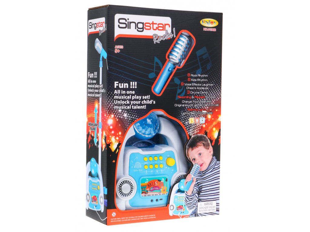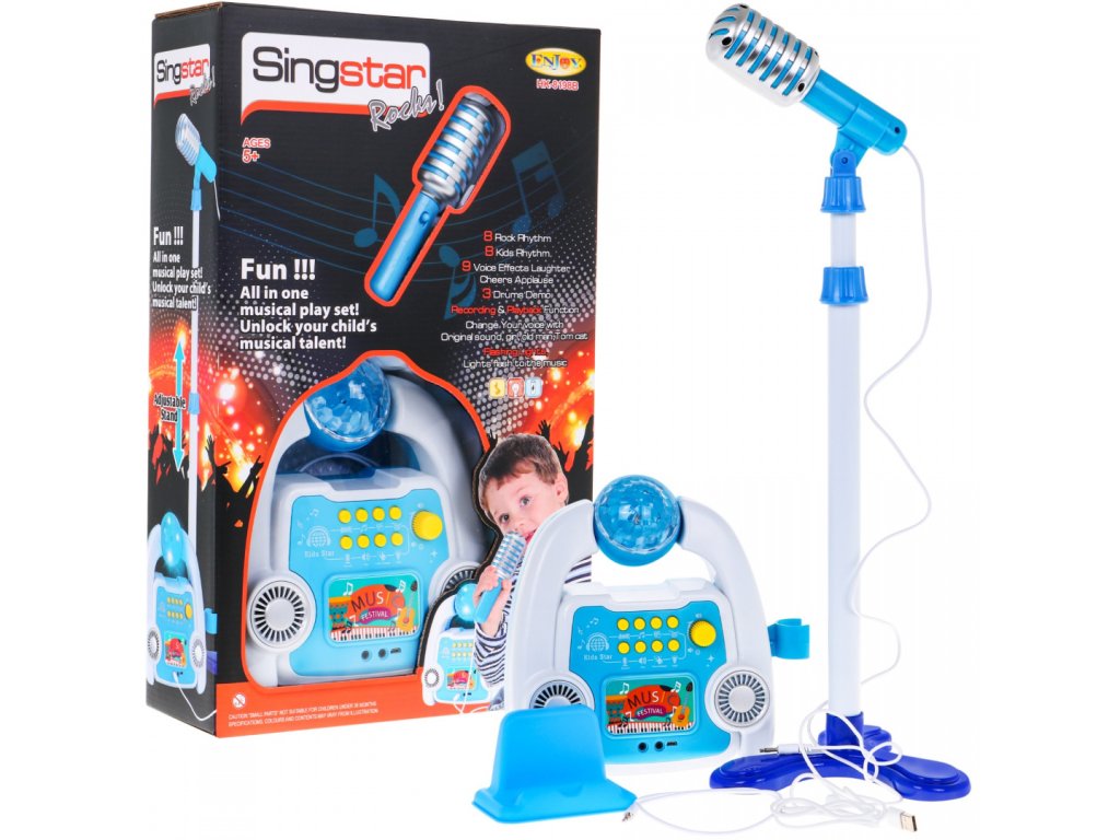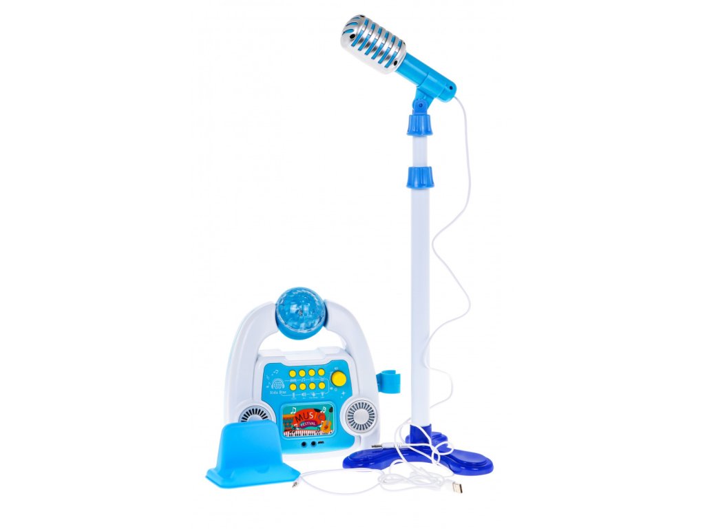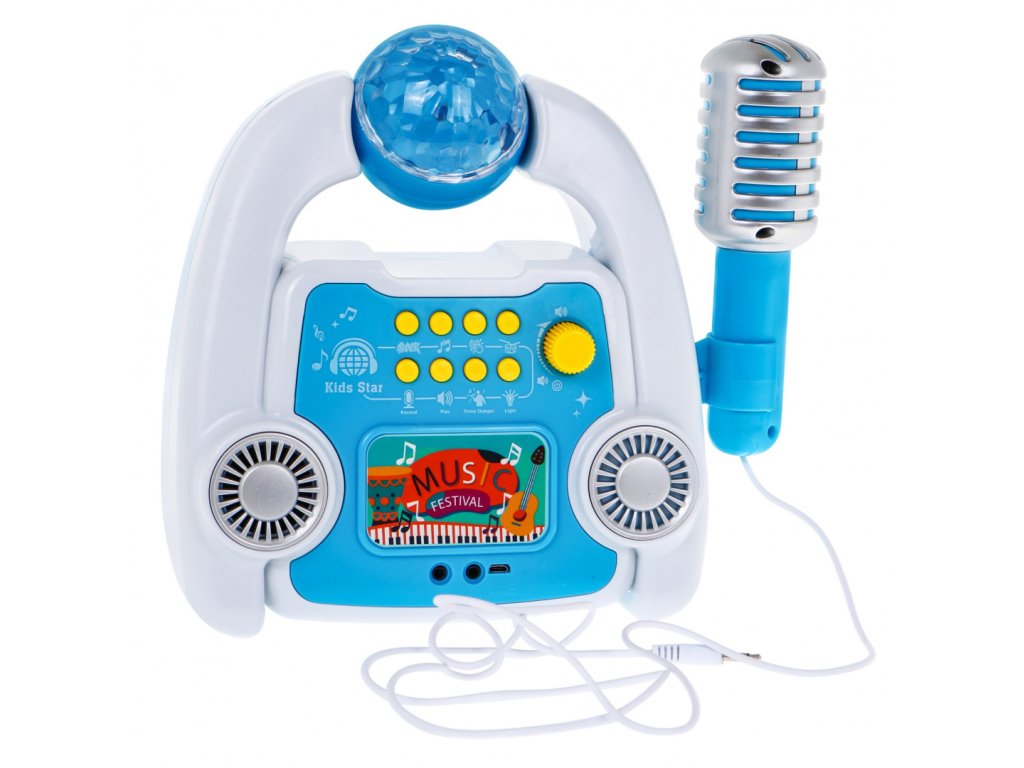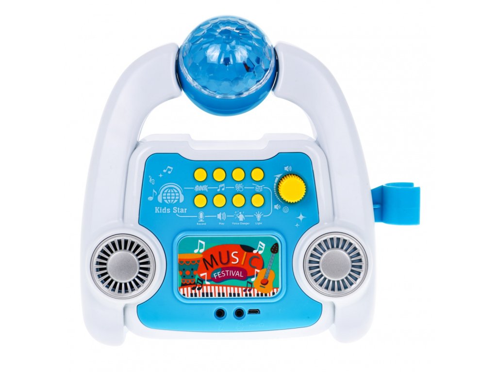 Functions | - 8 year music backgrounds, - 8 children's songs, - 9 sound effects: applause, cheers, laughter, - 3 drums, - recording, - playback, - 4 voice changer effects, - light effects, - volume control, - the ability to connect a phone or other USB device. |